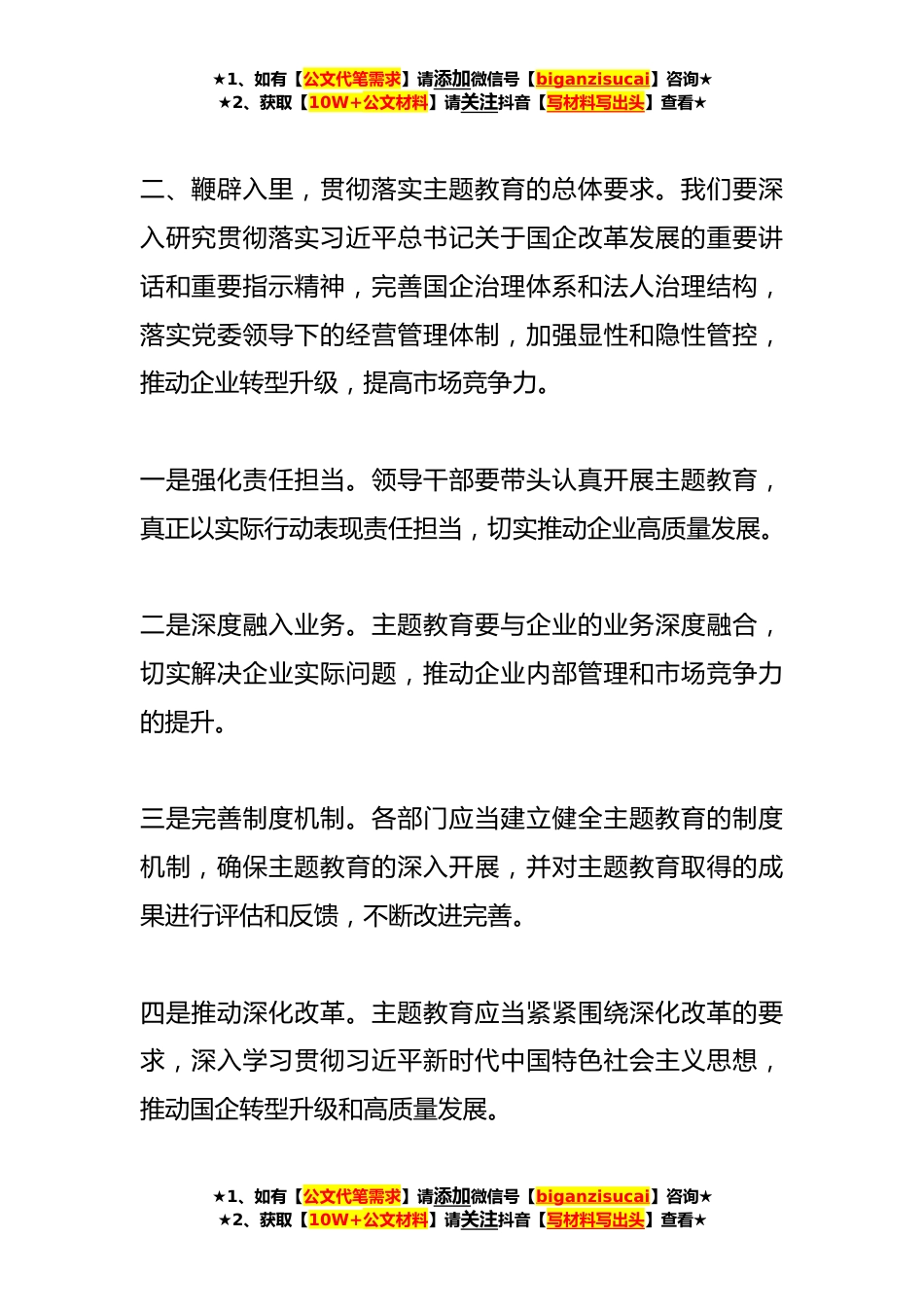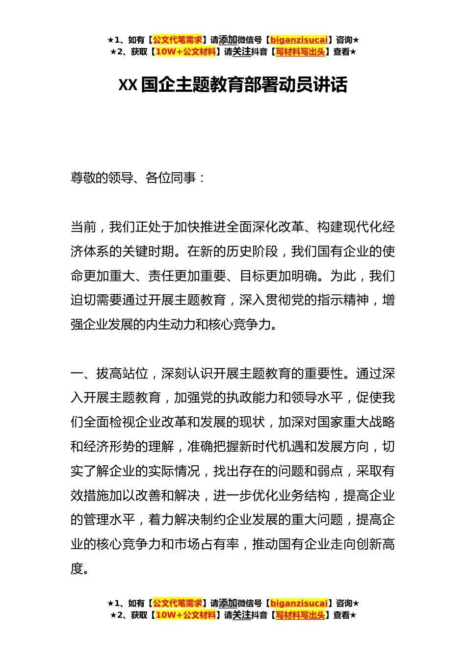 ★1、如有【公文代笔需求】请添加微信号【biganzisucai】咨询★★2、获取【10W+公文材料】请关注抖音【写材料写出头】查看★XX国企主题教育部署动员讲话尊敬的领导、各位同事:当前,我们正处于加快推进全面深化改革、构建现代化经济体系的关键时期。在新的历史阶段,我们国有企业的使命更加重大、责任更加重要、目标更加明确。为此,我们迫切需要通过开展主题教育,深入贯彻党的指示精神,增强企业发展的内生动力和核心竞争力。一、拔高站位,深刻认识开展主题教育的重要性。通过深入开展主题教育,加强党的执政能力和领导水平,促使我们全面检视企业改革和发展的现状,加深对国家重大战略和经济形势的理解,准确把握新时代机遇和发展方向,切实了解企业的实际情况,找出存在的问题和弱点,采取有效措施加以改善...