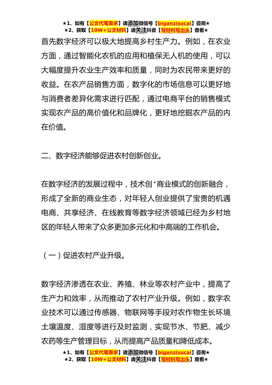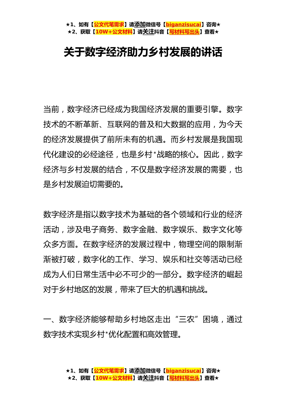 ★1、如有【公文代笔需求】请添加微信号【biganzisucai】咨询★★2、获取【10W+公文材料】请关注抖音【写材料写出头】查看★关于数字经济助力乡村发展的讲话当前,数字经济已经成为我国经济发展的重要引擎。数字技术的不断革新、互联网的普及和大数据的应用,为今天的经济发展提供了前所未有的机遇。而乡村发展是我国现代化建设的必经途径,也是乡村*战略的核心。因此,数字经济与乡村发展的结合,不仅是数字经济发展的需要,也是乡村发展迫切需要的。数字经济是指以数字技术为基础的各个领域和行业的经济活动,涉及电子商务、数字金融、数字娱乐、数字文化等众多方面。在数字经济的发展过程中,物理空间的限制渐渐被打破,数字化的工作、学习、娱乐和社交等活动已经成为人们日常生活中必不可少的一部分。数字经济...