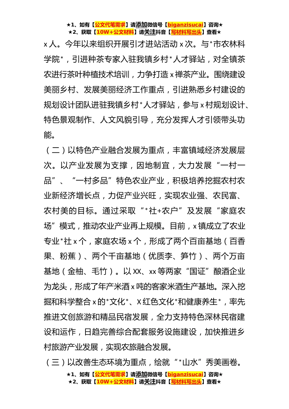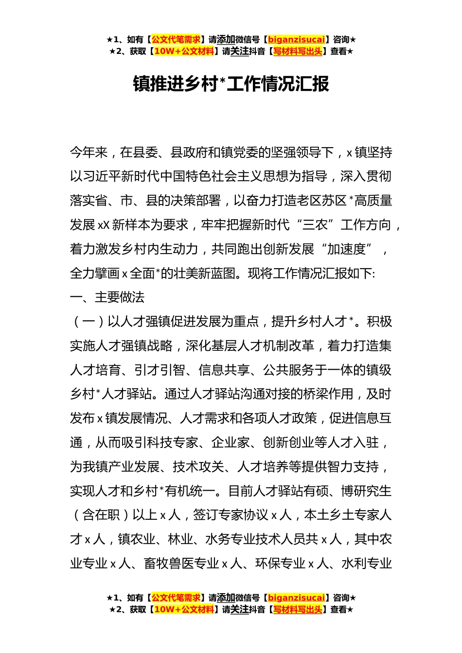 ★1、如有【公文代笔需求】请添加微信号【biganzisucai】咨询★★2、获取【10W+公文材料】请关注抖音【写材料写出头】查看★镇推进乡村*工作情况汇报今年来,在县委、县政府和镇党委的坚强领导下,x镇坚持以习近平新时代中国特色社会主义思想为指导,深入贯彻落实省、市、县的决策部署,以奋力打造老区苏区*高质量发展xX新样本为要求,牢牢把握新时代“三农”工作方向,着力激发乡村内生动力,共同跑出创新发展“加速度”,全力擘画x全面*的壮美新蓝图。现将工作情况汇报如下:一、主要做法(一)以人才强镇促进发展为重点,提升乡村人才*。积极实施人才强镇战略,深化基层人才机制改革,着力打造集人才培育、引才引智、信息共享、公共服务于一体的镇级乡村*人才驿站。通过人才驿站沟通对接的桥梁作用,及时发布x镇...