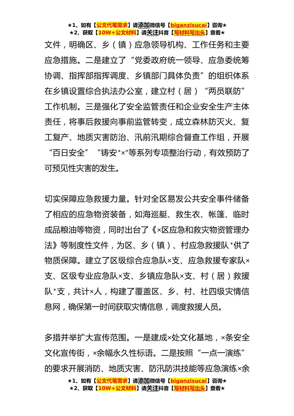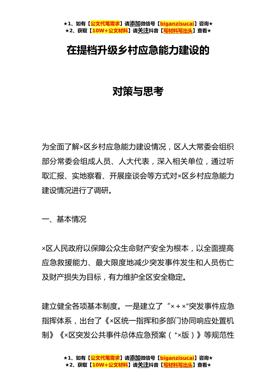 ★1、如有【公文代笔需求】请添加微信号【biganzisucai】咨询★★2、获取【10W+公文材料】请关注抖音【写材料写出头】查看★在提档升级乡村应急能力建设的对策与思考为全面了解×区乡村应急能力建设情况,区人大常委会组织部分常委会组成人员、人大代表,深入相关单位,通过听取汇报、实地察看、开展座谈会等方式对×区乡村应急能力建设情况进行了调研。一、基本情况×区人民政府以保障公众生命财产安全为根本,以全面提高应急救援能力、最大限度地减少突发事件发生和人员伤亡及财产损失为目标,有力维护全区安全稳定。建立健全各项基本制度。一是建立了“×+×”突发事件应急指挥体系,出台了《×区统一指挥和多部门协同响应处置机制》《×区突发公共事件总体应急预案(*×版)》等规范性★1、如有【公文代笔需...