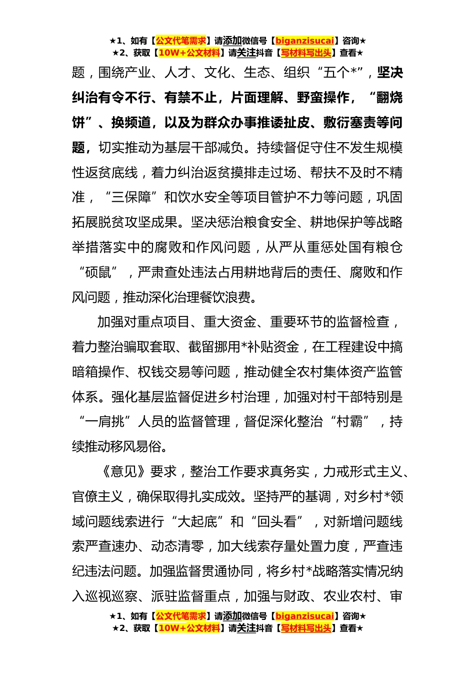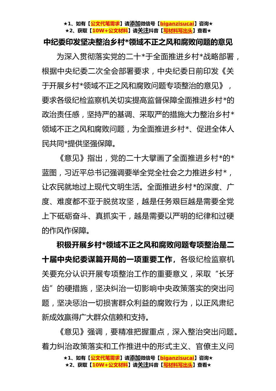 ★1、如有【公文代笔需求】请添加微信号【biganzisucai】咨询★★2、获取【10W+公文材料】请关注抖音【写材料写出头】查看★中纪委印发坚决整治乡村*领域不正之风和腐败问题的意见为深入贯彻落实党的二十*于全面推进乡村*战略部署,根据中央纪委二次全会部署要求,中央纪委日前印发《关于开展乡村*领域不正之风和腐败问题专项整治的意见》,要求各级纪检监察机关切实提高监督保障全面推进乡村*的政治责任感,坚持严的基调、采取严的措施大力整治乡村*领域不正之风和腐败问题,为全面推进乡村*、促进全体人民共同*提供坚强保障。《意见》指出,党的二十大擘画了全面推进乡村*的*蓝图,习近平总书记强调要举全党全社会之力推进乡村*,让农民就地过上现代文明生活。全面推进乡村*的深度、广度、难度都不亚于脱贫攻坚...