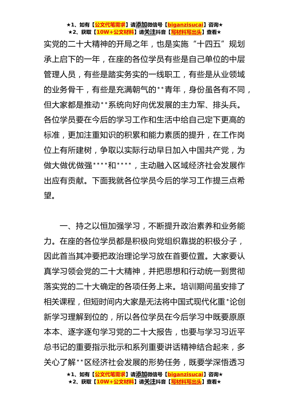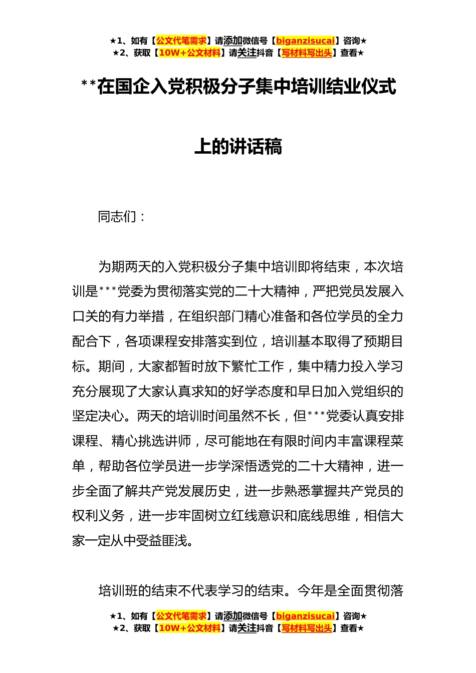★1、如有【公文代笔需求】请添加微信号【biganzisucai】咨询★★2、获取【10W+公文材料】请关注抖音【写材料写出头】查看★**在国企入党积极分子集中培训结业仪式上的讲话稿同志们:为期两天的入党积极分子集中培训即将结束,本次培训是***党委为贯彻落实党的二十大精神,严把党员发展入口关的有力举措,在组织部门精心准备和各位学员的全力配合下,各项课程安排落实到位,培训基本取得了预期目标。期间,大家都暂时放下繁忙工作,集中精力投入学习充分展现了大家认真求知的好学态度和早日加入党组织的坚定决心。两天的培训时间虽然不长,但***党委认真安排课程、精心挑选讲师,尽可能地在有限时间内丰富课程菜单,帮助各位学员进一步学深悟透党的二十大精神,进一步全面了解共产党发展历史,进一步熟悉掌握共产...