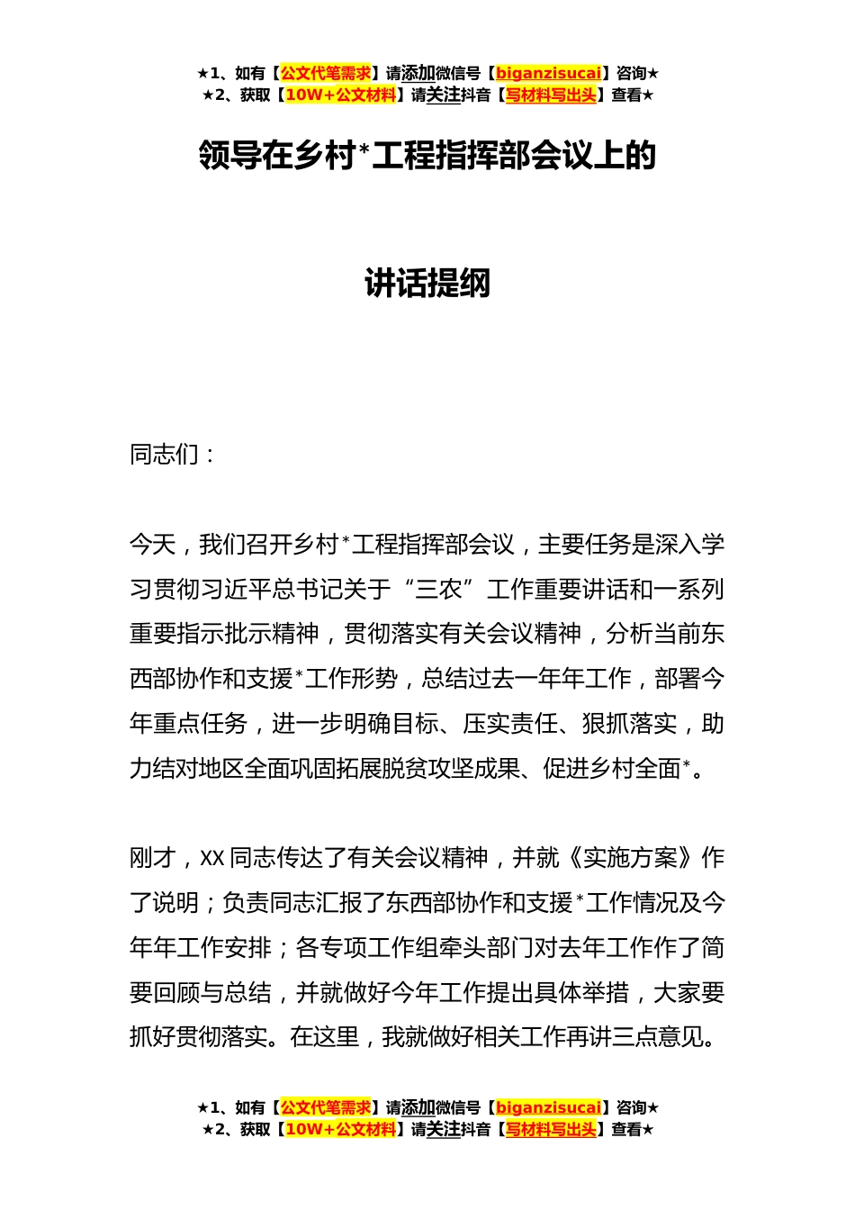 ★1、如有【公文代笔需求】请添加微信号【biganzisucai】咨询★★2、获取【10W+公文材料】请关注抖音【写材料写出头】查看★领导在乡村*工程指挥部会议上的讲话提纲同志们:今天,我们召开乡村*工程指挥部会议,主要任务是深入学习贯彻习近平总书记关于“三农”工作重要讲话和一系列重要指示批示精神,贯彻落实有关会议精神,分析当前东西部协作和支援*工作形势,总结过去一年年工作,部署今年重点任务,进一步明确目标、压实责任、狠抓落实,助力结对地区全面巩固拓展脱贫攻坚成果、促进乡村全面*。刚才,XX同志传达了有关会议精神,并就《实施方案》作了说明;负责同志汇报了东西部协作和支援*工作情况及今年年工作安排;各专项工作组牵头部门对去年工作作了简要回顾与总结,并就做好今年工作提出具体举措,大家...