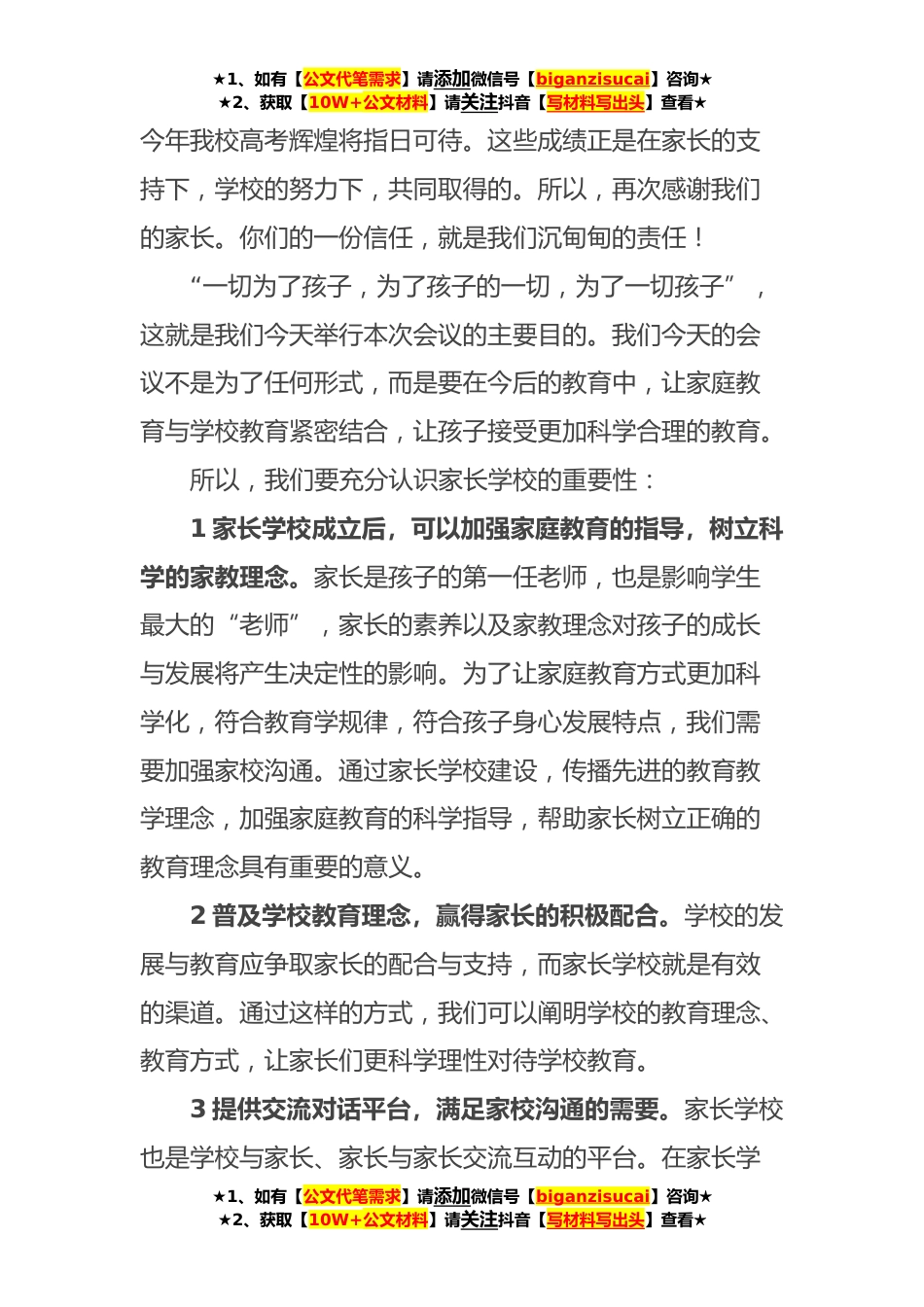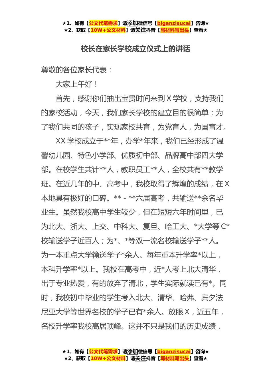 ★1、如有【公文代笔需求】请添加微信号【biganzisucai】咨询★★2、获取【10W+公文材料】请关注抖音【写材料写出头】查看★校长在家长学校成立仪式上的讲话尊敬的各位家长代表:大家上午好!首先,感谢你们抽出宝贵时间来到X学校,支持我们的家校活动,今天,我们家长学校的建立目的很简单:为了我们共同的孩子,实现家校共育,为党育人,为国育才。XX学校成立于**年,办学*年来,我们已经形成了温馨幼儿园、特色小学部、优质初中部、品牌高中部四大学部。在校学生共计**人,教职员工**人,全校共有**教学班。在近几年的中、高考中,我校取得了辉煌的成绩,在X本地具有极好的口碑。**-**六届高考,共输送**余名毕业生。虽然我校高中学生较少,但在短短六年时间里,已为北大、浙大、上交、中科大、复旦、哈工大、...
