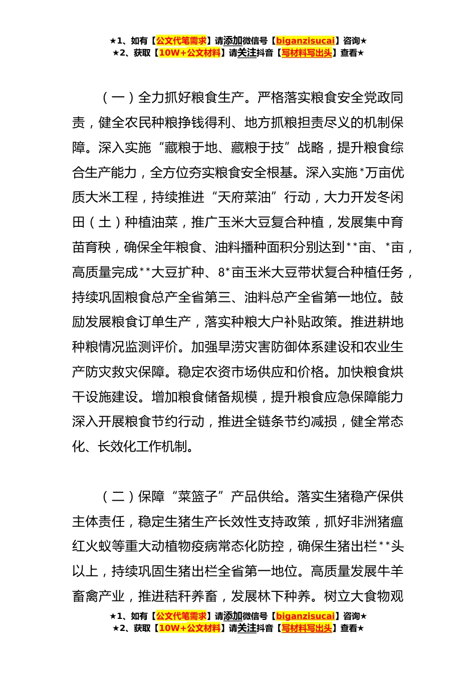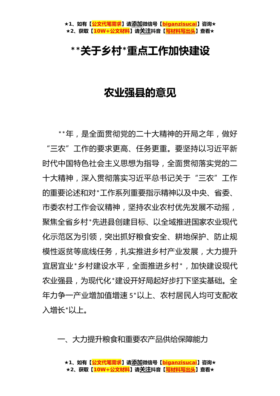 ★1、如有【公文代笔需求】请添加微信号【biganzisucai】咨询★★2、获取【10W+公文材料】请关注抖音【写材料写出头】查看★**关于乡村*重点工作加快建设农业强县的意见**年,是全面贯彻党的二十大精神的开局之年,做好“三农”工作的要求更高、任务更重。要坚持以习近平新时代中国特色社会主义思想为指导,全面贯彻落实党的二十大精神,深入贯彻落实习近平总书记关于“三农”工作的重要论述和对*工作系列重要指示精神以及中央、省委、市委农村工作会议精神,坚持农业农村优先发展不动摇,聚焦全省乡村*先进县创建目标、以全域推进国家农业现代化示范区为引领,突出抓好粮食安全、耕地保护、防止规模性返贫等底线任务,扎实推进乡村产业发展,大力提升宜居宜业*乡村建设水平,全面推进乡村*,加快建设现代农业强县...