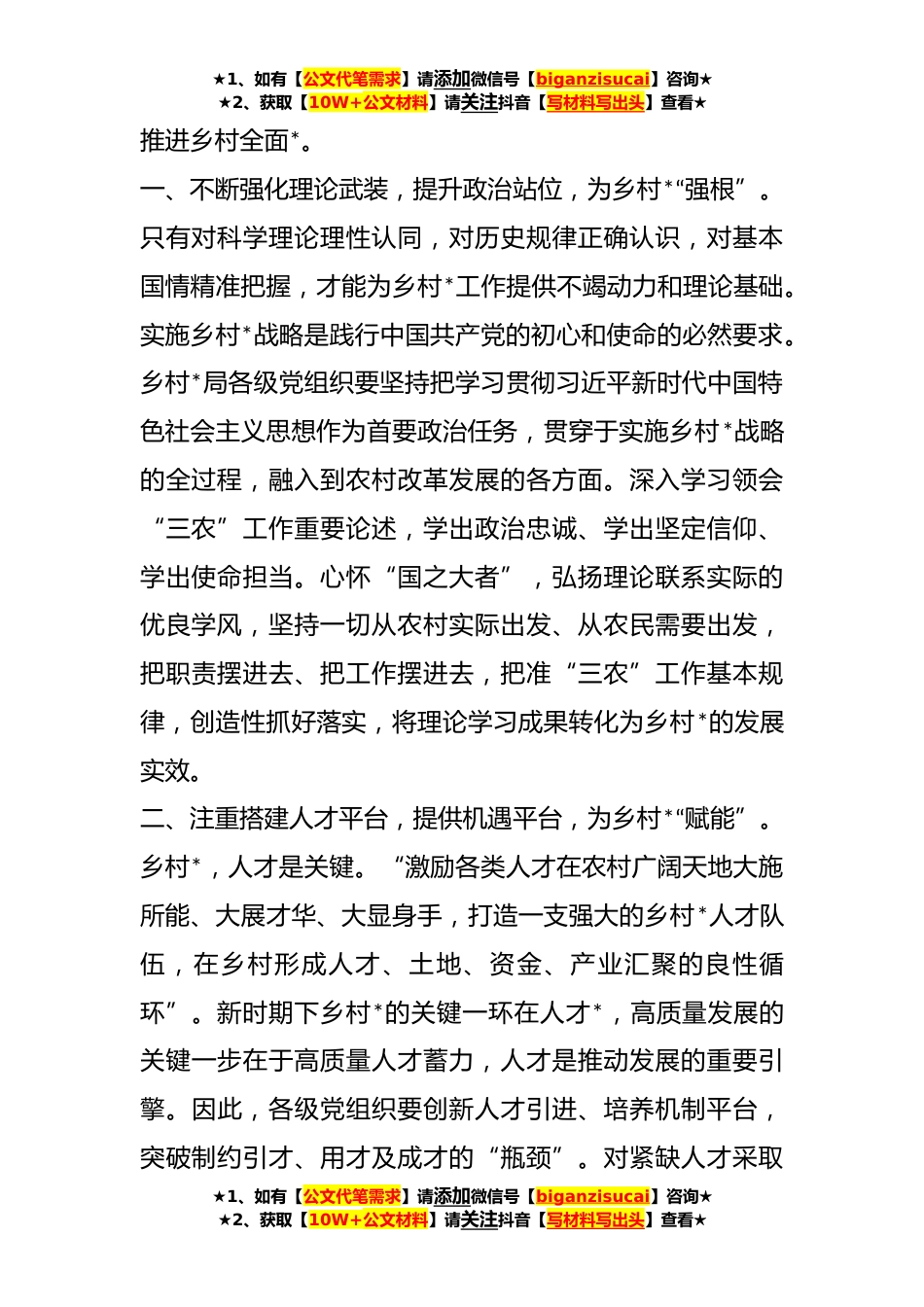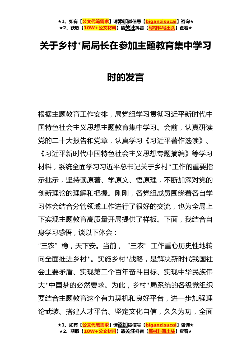 ★1、如有【公文代笔需求】请添加微信号【biganzisucai】咨询★★2、获取【10W+公文材料】请关注抖音【写材料写出头】查看★关于乡村*局局长在参加主题教育集中学习时的发言根据主题教育工作安排,局党组学习贯彻习近平新时代中国特色社会主义思想主题教育集中学习。会前,认真研读党的二十大报告和党章,认真学习《习近平著作选读》、《习近平新时代中国特色社会主义思想专题摘编》等学习材料,系统全面学习习近平总书记关于乡村*工作的重要指示批示,坚持读原著、学原文、悟原理,不断加深对党的创新理论的理解和把握。刚刚,各党组成员围绕着各自学习体会结合分管领域工作进行了很好的交流,也为全局上下实现主题教育高质量开局提供了样板。下面,我结合自身学习感悟,谈以下体会:“三农”稳,天下安。当前,...