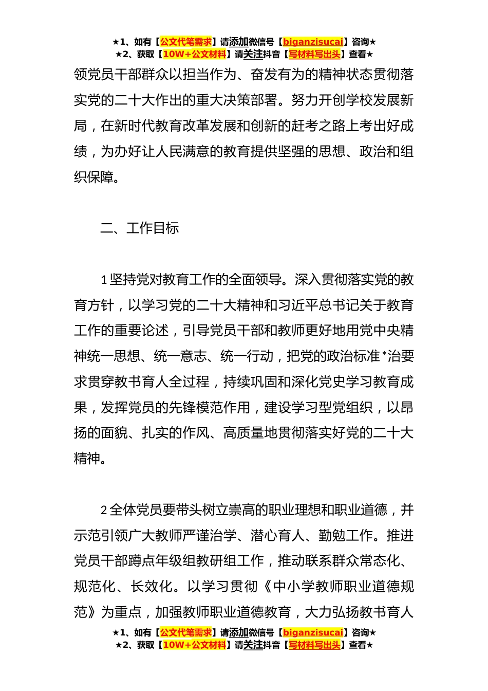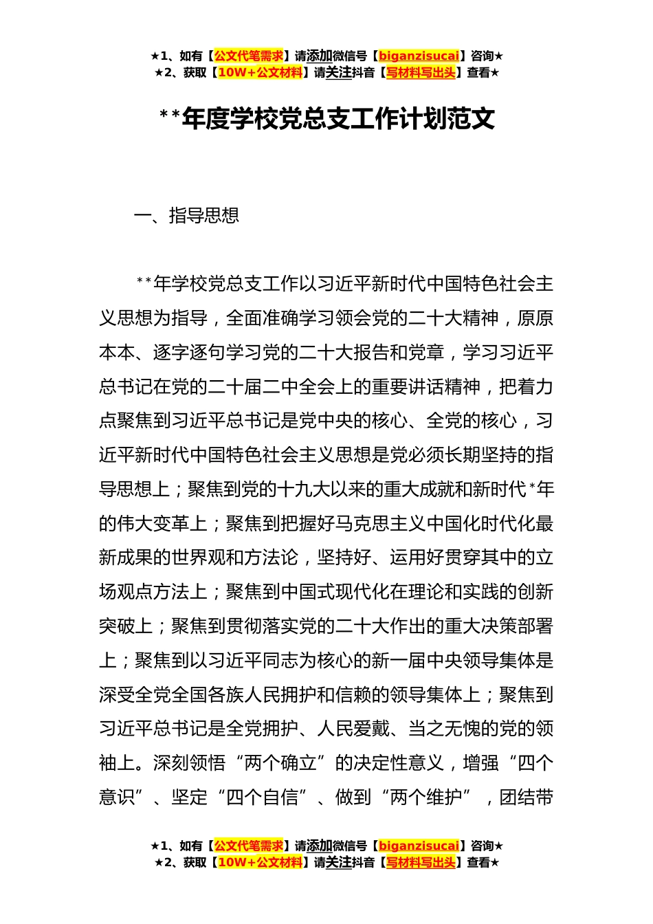 ★1、如有【公文代笔需求】请添加微信号【biganzisucai】咨询★★2、获取【10W+公文材料】请关注抖音【写材料写出头】查看★**年度学校党总支工作计划范文一、指导思想**年学校党总支工作以习近平新时代中国特色社会主义思想为指导,全面准确学习领会党的二十大精神,原原本本、逐字逐句学习党的二十大报告和党章,学习习近平总书记在党的二十届二中全会上的重要讲话精神,把着力点聚焦到习近平总书记是党中央的核心、全党的核心,习近平新时代中国特色社会主义思想是党必须长期坚持的指导思想上;聚焦到党的十九大以来的重大成就和新时代*年的伟大变革上;聚焦到把握好马克思主义中国化时代化最新成果的世界观和方法论,坚持好、运用好贯穿其中的立场观点方法上;聚焦到中国式现代化在理论和实践的创新突破上;聚...