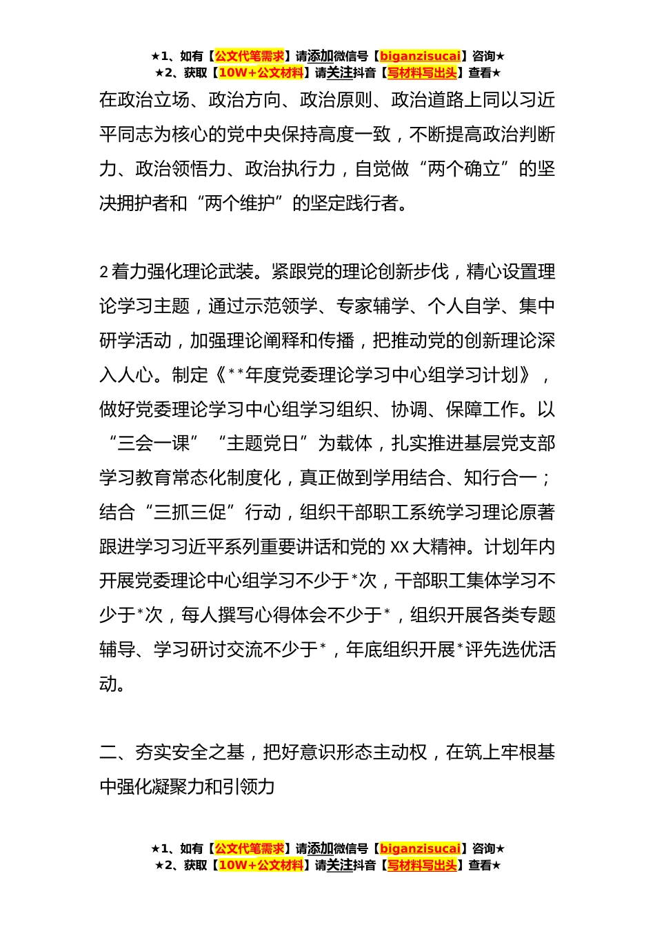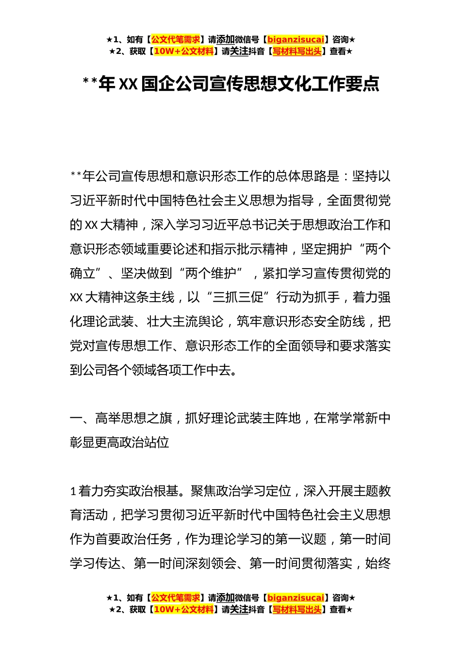 ★1、如有【公文代笔需求】请添加微信号【biganzisucai】咨询★★2、获取【10W+公文材料】请关注抖音【写材料写出头】查看★**年XX国企公司宣传思想文化工作要点**年公司宣传思想和意识形态工作的总体思路是:坚持以习近平新时代中国特色社会主义思想为指导,全面贯彻党的XX大精神,深入学习习近平总书记关于思想政治工作和意识形态领域重要论述和指示批示精神,坚定拥护“两个确立”、坚决做到“两个维护”,紧扣学习宣传贯彻党的XX大精神这条主线,以“三抓三促”行动为抓手,着力强化理论武装、壮大主流舆论,筑牢意识形态安全防线,把党对宣传思想工作、意识形态工作的全面领导和要求落实到公司各个领域各项工作中去。一、高举思想之旗,抓好理论武装主阵地,在常学常新中彰显更高政治站位1着力夯实政治根基。...