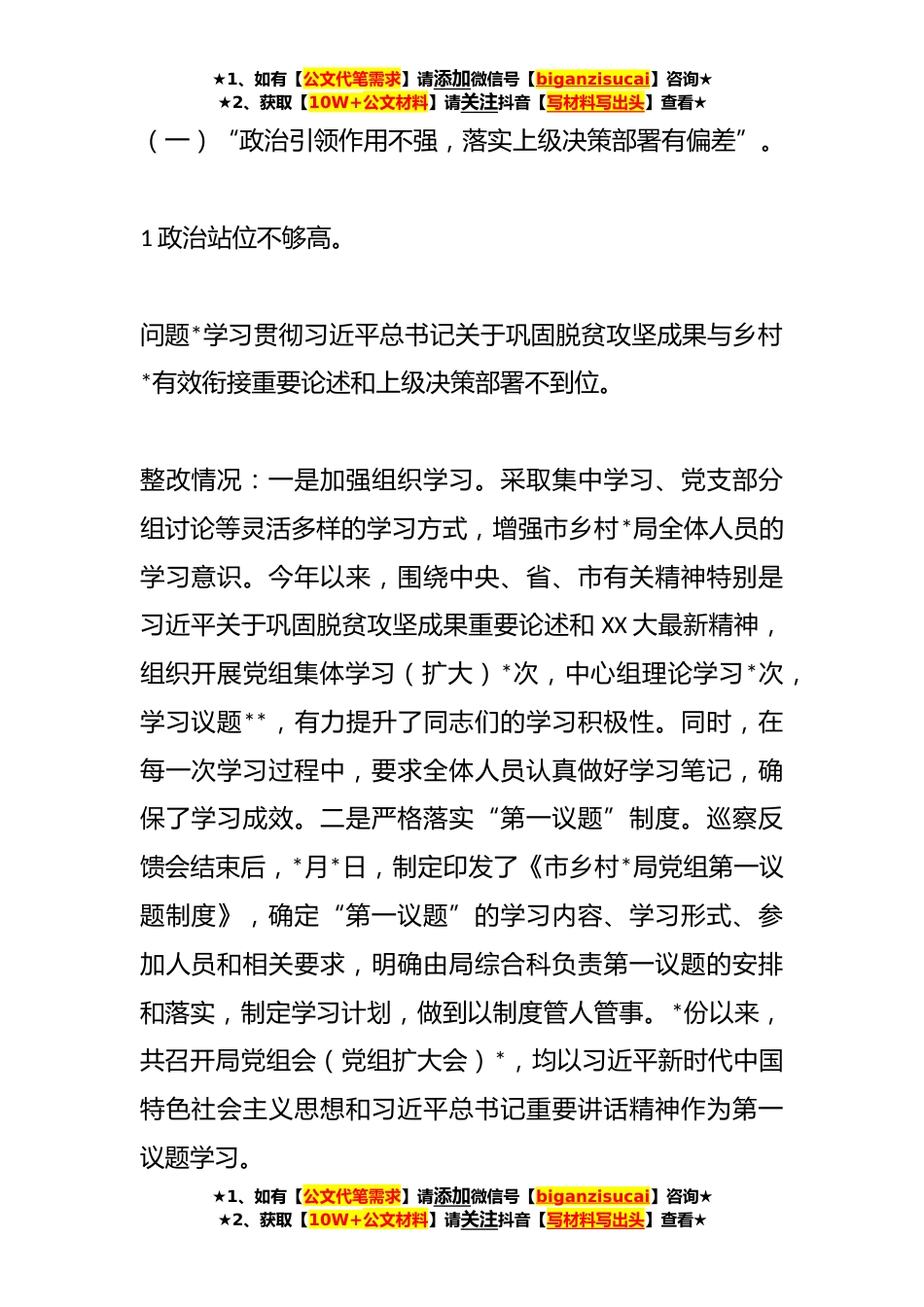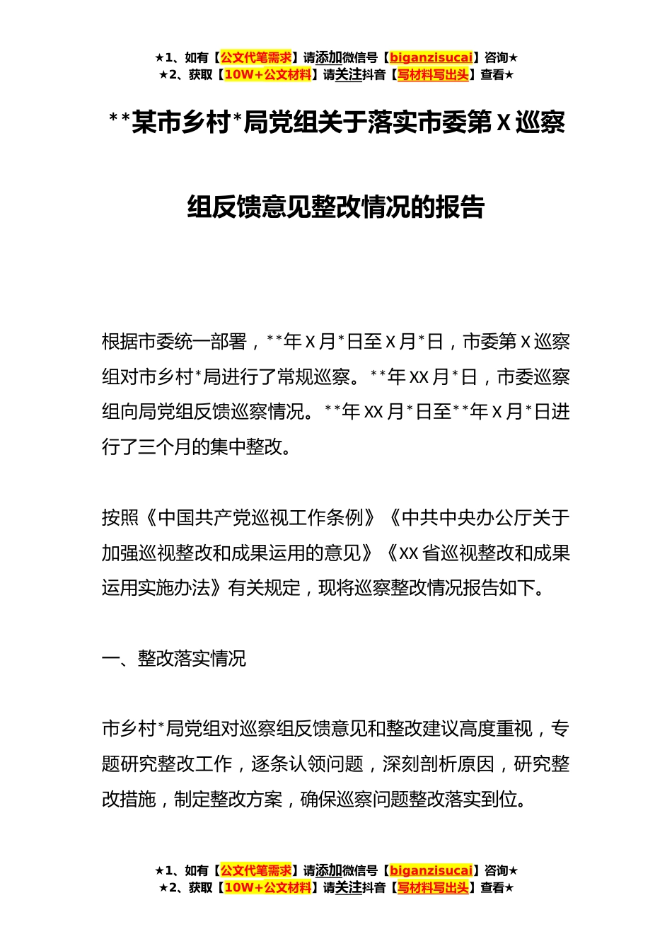 ★1、如有【公文代笔需求】请添加微信号【biganzisucai】咨询★★2、获取【10W+公文材料】请关注抖音【写材料写出头】查看★**某市乡村*局党组关于落实市委第X巡察组反馈意见整改情况的报告根据市委统一部署,**年X月*日至X月*日,市委第X巡察组对市乡村*局进行了常规巡察。**年XX月*日,市委巡察组向局党组反馈巡察情况。**年XX月*日至**年X月*日进行了三个月的集中整改。按照《中国共产党巡视工作条例》《中共中央办公厅关于加强巡视整改和成果运用的意见》《XX省巡视整改和成果运用实施办法》有关规定,现将巡察整改情况报告如下。一、整改落实情况市乡村*局党组对巡察组反馈意见和整改建议高度重视,专题研究整改工作,逐条认领问题,深刻剖析原因,研究整改措施,制定整改方案,确保巡察问题整改落实到位。★...