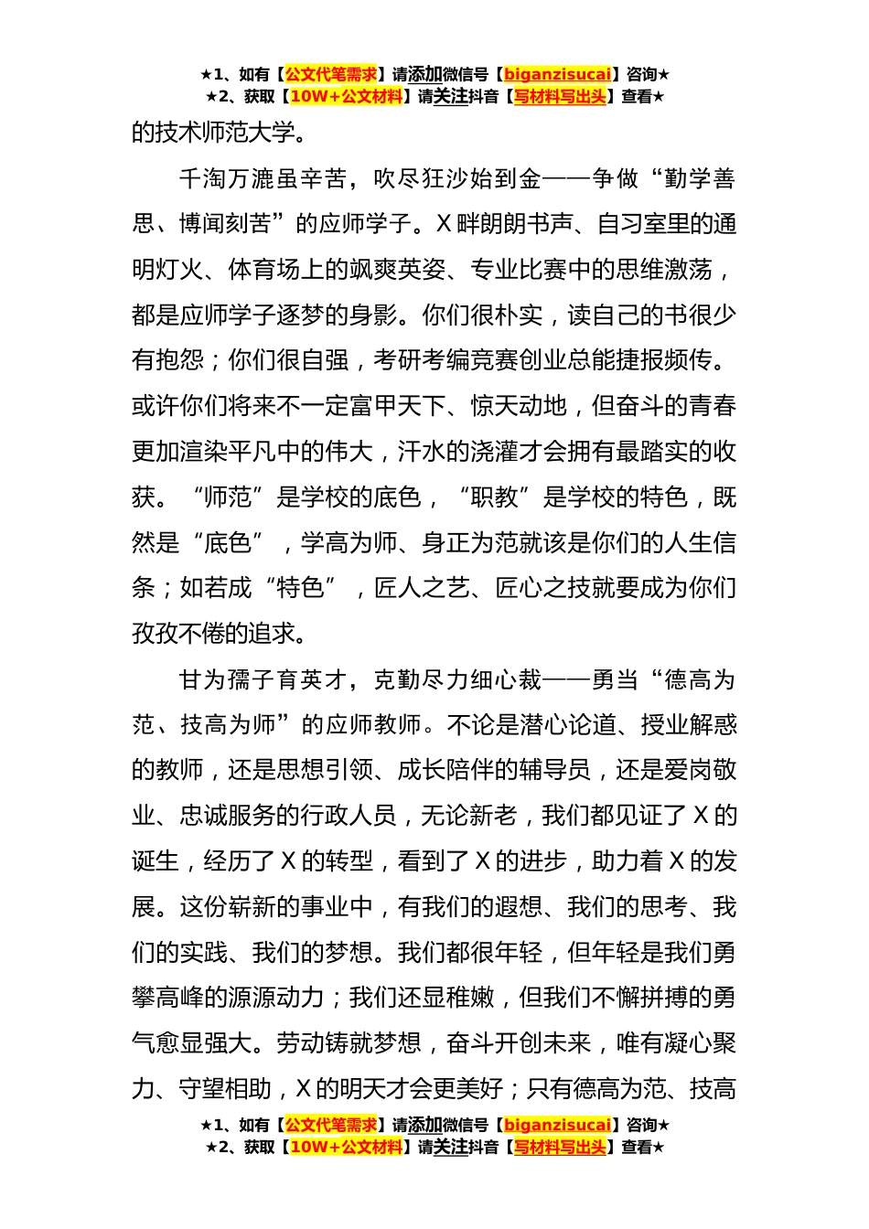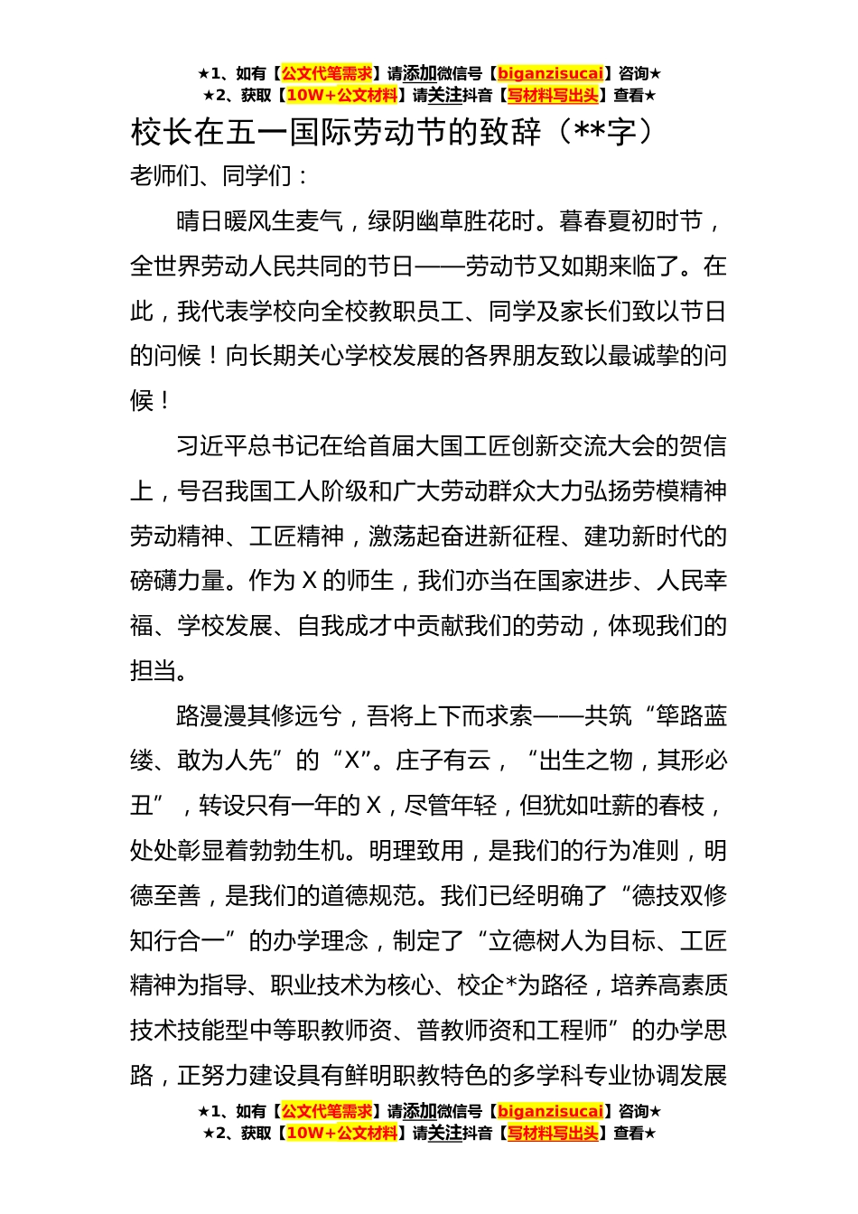 ★1、如有【公文代笔需求】请添加微信号【biganzisucai】咨询★★2、获取【10W+公文材料】请关注抖音【写材料写出头】查看★校长在五一国际劳动节的致辞(**字)老师们、同学们:晴日暖风生麦气,绿阴幽草胜花时。暮春夏初时节,全世界劳动人民共同的节日——劳动节又如期来临了。在此,我代表学校向全校教职员工、同学及家长们致以节日的问候!向长期关心学校发展的各界朋友致以最诚挚的问候!习近平总书记在给首届大国工匠创新交流大会的贺信上,号召我国工人阶级和广大劳动群众大力弘扬劳模精神劳动精神、工匠精神,激荡起奋进新征程、建功新时代的磅礴力量。作为X的师生,我们亦当在国家进步、人民幸福、学校发展、自我成才中贡献我们的劳动,体现我们的担当。路漫漫其修远兮,吾将上下而求索——共筑“筚路蓝...