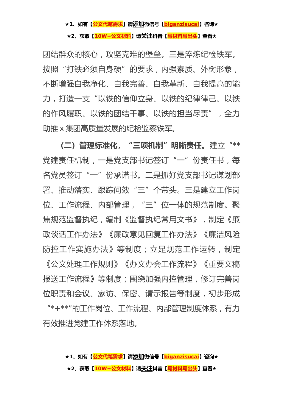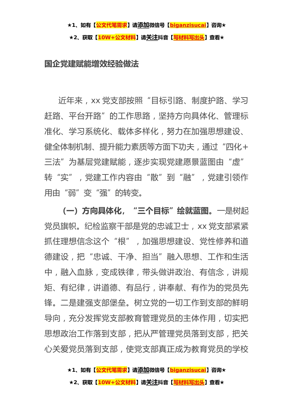 ★1、如有【公文代笔需求】请添加微信号【biganzisucai】咨询★★2、获取【10W+公文材料】请关注抖音【写材料写出头】查看★国企党建赋能增效经验做法近年来,xx党支部按照“目标引路、制度护路、学习赶路、平台开路”的工作思路,坚持方向具体化、管理标准化、学习系统化、载体多样化,努力在加强思想建设、健全体制机制、提升能力素质等方面下功夫,通过“四化+三法”为基层党建赋能,逐步实现党建愿景蓝图由“虚”转“实”,党建工作内容由“散”到“融”,党建引领作用由“弱”变“强”的转变。(一)方向具体化,“三个目标”绘就蓝图。一是树起党员旗帜。纪检监察干部是党的忠诚卫士,xx党支部紧紧抓住理想信念这个“根”,加强思想建设、党性修养和道德建设,把“忠诚、干净、担当”融入思想、工作和生活中...
