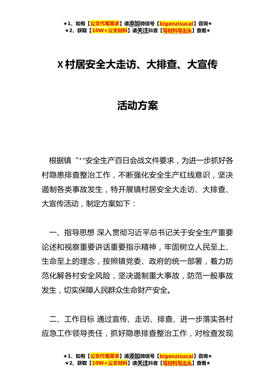 ★1、如有【公文代笔需求】请添加微信号【biganzisucai】咨询★★2、获取【10W+公文材料】请关注抖音【写材料写出头】查看★X村居安全大走访、大排查、大宣传活动方案根据镇“*”安全生产百日会战文件要求,为进一步抓好各村隐患排查整治工作,不断强化安全生产红线意识,坚决遏制各类事故发生,特开展镇村居安全大走访、大排查、大宣传活动,制定方案如下:一、指导思想深入贯彻习近平总书记关于安全生产重要论述和视察重要讲话重要指示精神,牢固树立人民至上、生命至上的理念,按照镇党委、政府的统一部署,着力防范化解各村安全风险,坚决遏制重大事故,防范一般事故发生,切实保障人民群众生命财产安全。二、工作目标通过宣传、走访、排查、进一步落实各村应急工作领导责任,抓好隐患排查整治工作,对检查发...