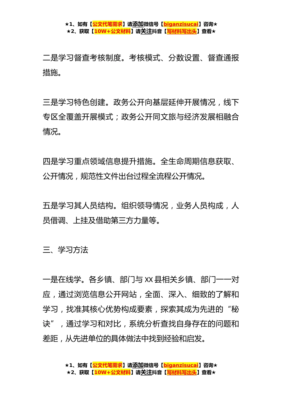 ★1、如有【公文代笔需求】请添加微信号【biganzisucai】咨询★★2、获取【10W+公文材料】请关注抖音【写材料写出头】查看★XX县政务公开“学先进、补短板、创优秀”提升行动实施方案根据XX市人民政府办公室《关于印发《XX市政务公开”学先进、补短板、创优秀”提升行动实施方案》的通知》要求,为全面提升我县政务公开工作水平,对标省内政务公开先进县,认真梳理全县政府信息公开工作短板弱项,进一步理清思路、分析研判、找出短板、立行立改,确保全年政务公开再上新台阶,特制定以下方案。一、学习对象XX市XX县二、学习内容一是学习优秀工作制度。信息审核、脱敏、发布技巧,错敏词检测及网络安全。★1、如有【公文代笔需求】请添加微信号【biganzisucai】咨询★★2、获取【10W+公文材料】请关注抖音【写材料...