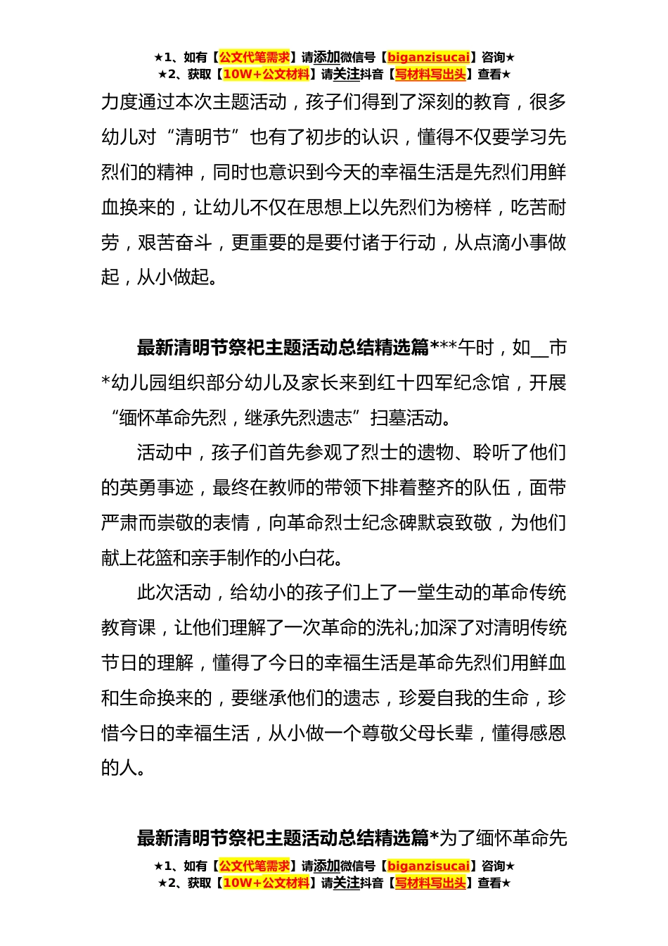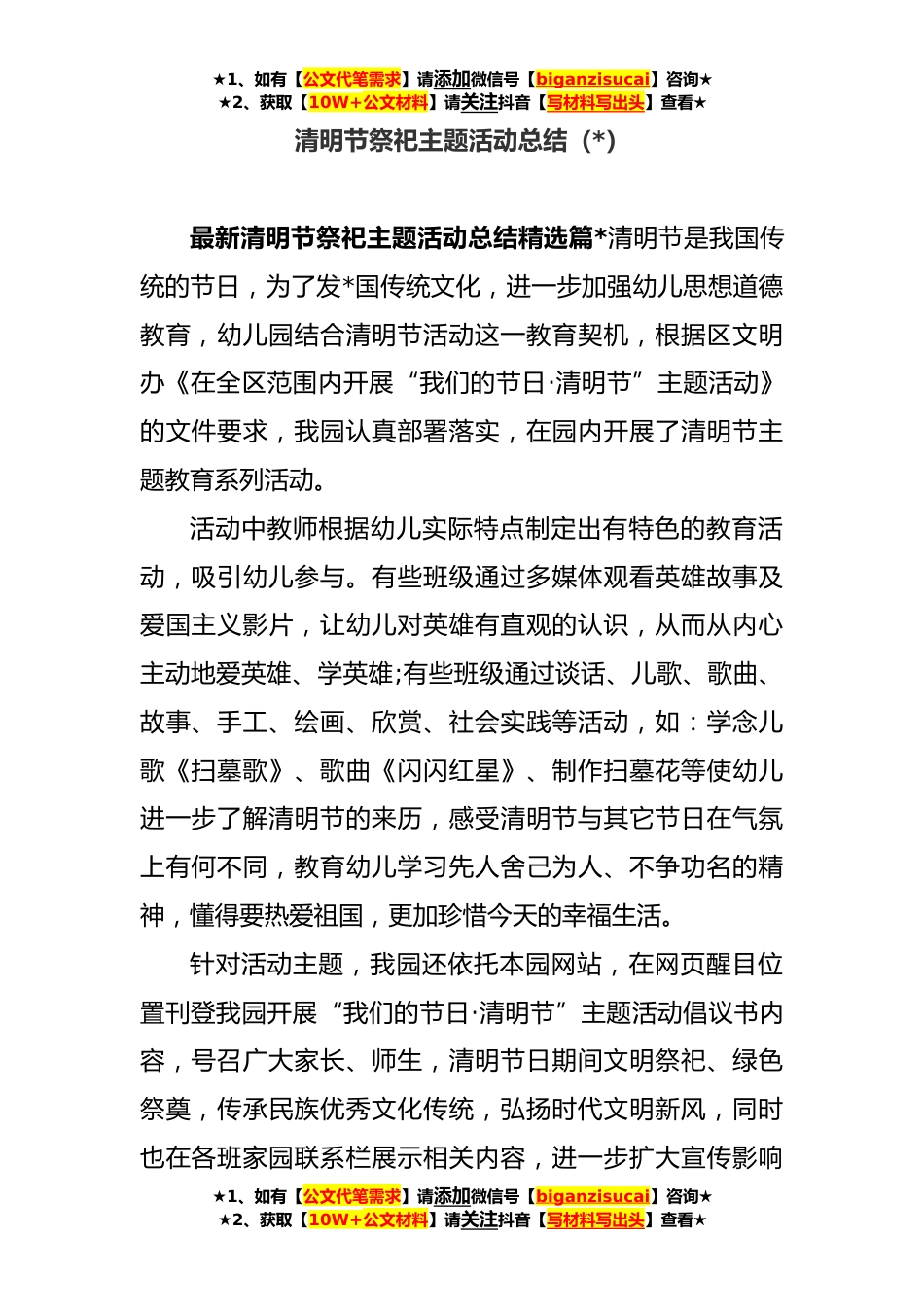 ★1、如有【公文代笔需求】请添加微信号【biganzisucai】咨询★★2、获取【10W+公文材料】请关注抖音【写材料写出头】查看★清明节祭祀主题活动总结(*)最新清明节祭祀主题活动总结精选篇*清明节是我国传统的节日,为了发*国传统文化,进一步加强幼儿思想道德教育,幼儿园结合清明节活动这一教育契机,根据区文明办《在全区范围内开展“我们的节日·清明节”主题活动》的文件要求,我园认真部署落实,在园内开展了清明节主题教育系列活动。活动中教师根据幼儿实际特点制定出有特色的教育活动,吸引幼儿参与。有些班级通过多媒体观看英雄故事及爱国主义影片,让幼儿对英雄有直观的认识,从而从内心主动地爱英雄、学英雄;有些班级通过谈话、儿歌、歌曲、故事、手工、绘画、欣赏、社会实践等活动,如:学念儿歌《扫...
