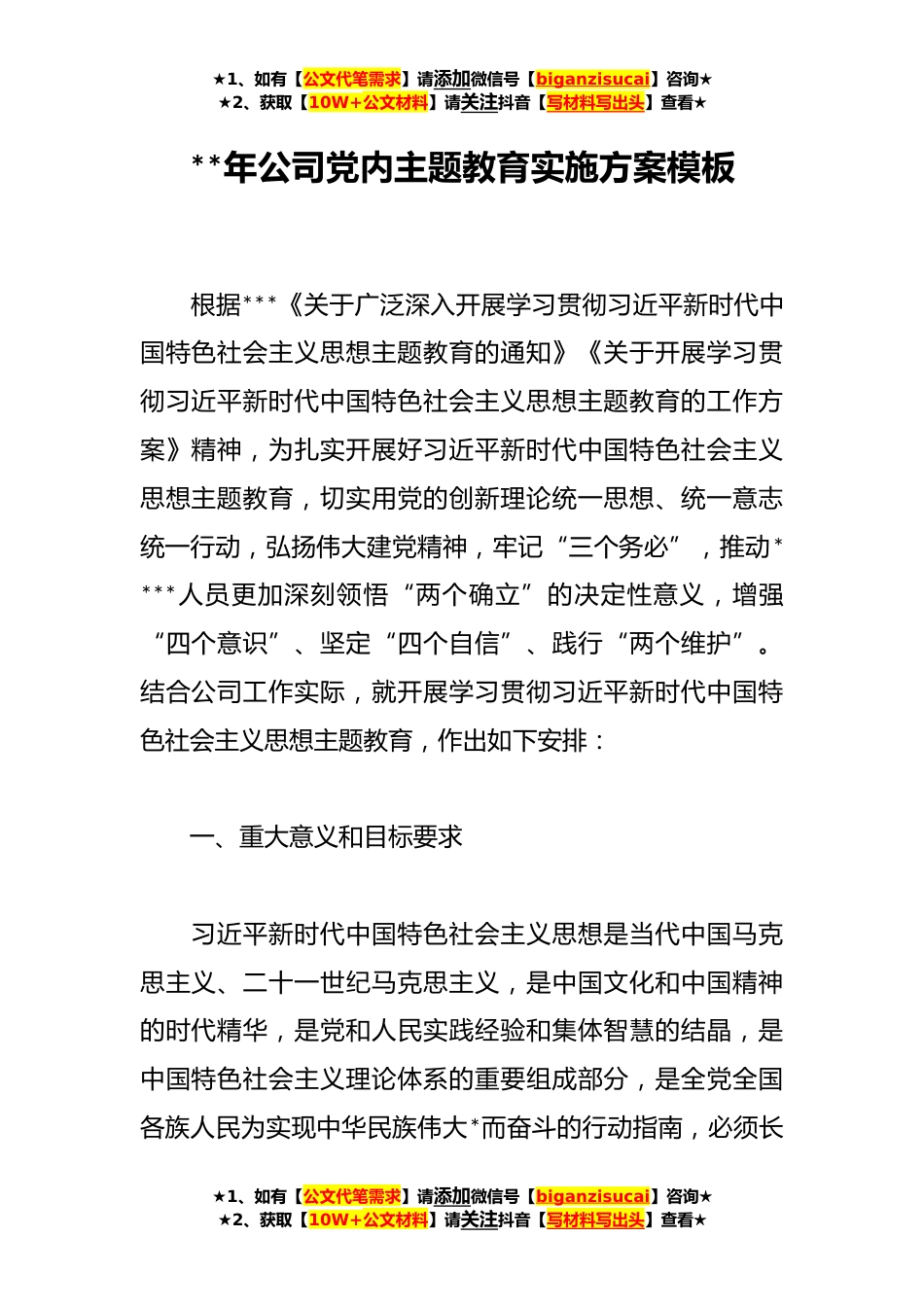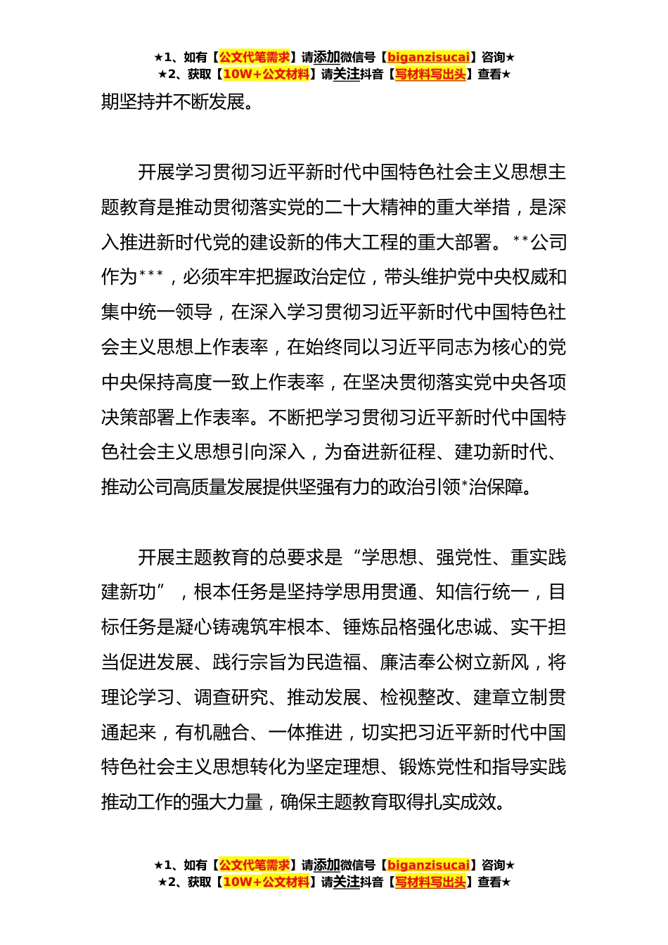 ★1、如有【公文代笔需求】请添加微信号【biganzisucai】咨询★★2、获取【10W+公文材料】请关注抖音【写材料写出头】查看★**年公司党内主题教育实施方案模板根据***《关于广泛深入开展学习贯彻习近平新时代中国特色社会主义思想主题教育的通知》《关于开展学习贯彻习近平新时代中国特色社会主义思想主题教育的工作方案》精神,为扎实开展好习近平新时代中国特色社会主义思想主题教育,切实用党的创新理论统一思想、统一意志统一行动,弘扬伟大建党精神,牢记“三个务必”,推动****人员更加深刻领悟“两个确立”的决定性意义,增强“四个意识”、坚定“四个自信”、践行“两个维护”。结合公司工作实际,就开展学习贯彻习近平新时代中国特色社会主义思想主题教育,作出如下安排:一、重大意义和目标要求习近平新...