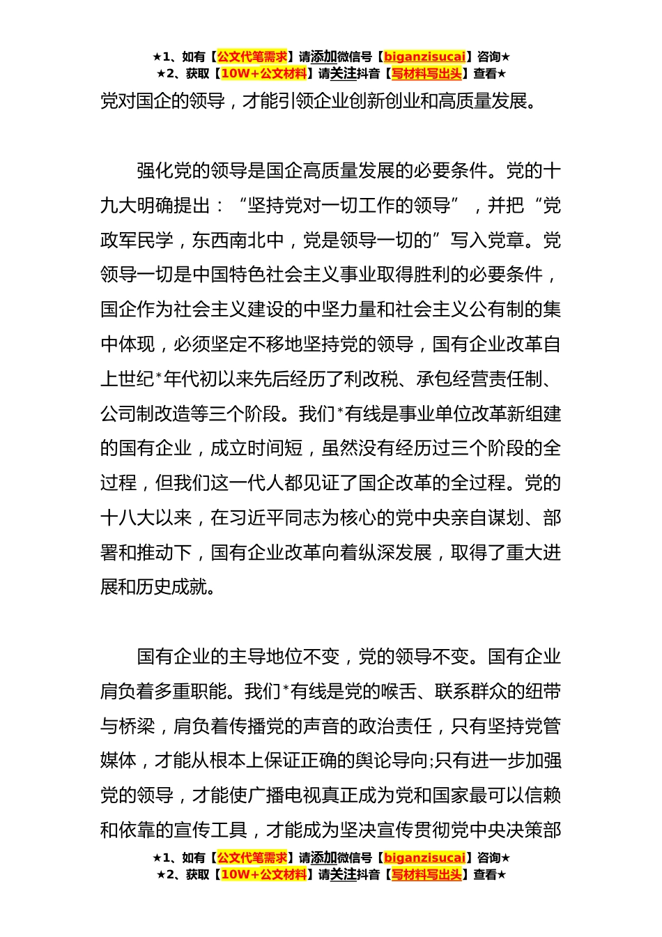 ★1、如有【公文代笔需求】请添加微信号【biganzisucai】咨询★★2、获取【10W+公文材料】请关注抖音【写材料写出头】查看★国企专题党课:以高质量党建引领保障国有企业高质量发展(*)篇*近段时间,又一次学习了中国文献出版社出版的习近平《论坚持党对一切工作的领导》的重要论述,作为国有企业的一名党务工作人员,对坚持党对一切工作的领导又有了新的更高认识。毋庸置疑,国有企业是中国特色社会主义的重要物质基础*治基础,是中国特色社会主义经济的“顶梁柱”,是姓社的、也是姓党的。坚持党对一切工作的领导,必须将党的政治建设作为一个永恒的课题,这是推进国有企业党建的首要任务,也是国企高质量发展保持方向不偏和防范治理风险的根本保证,更是推动国企转型升级、实现高质量发展的必要条件。当前*有...