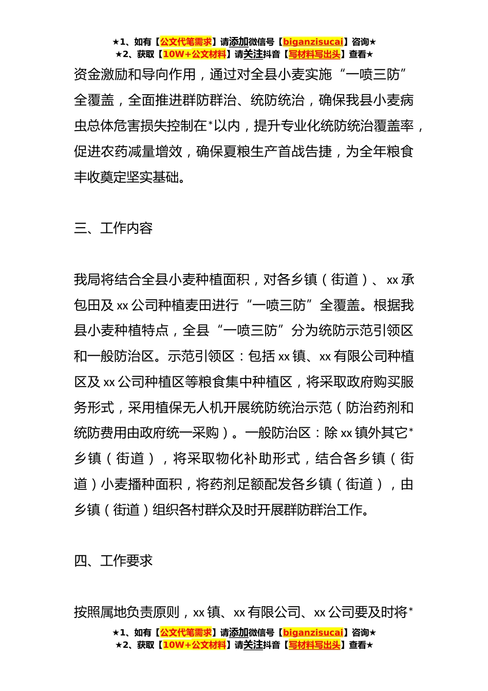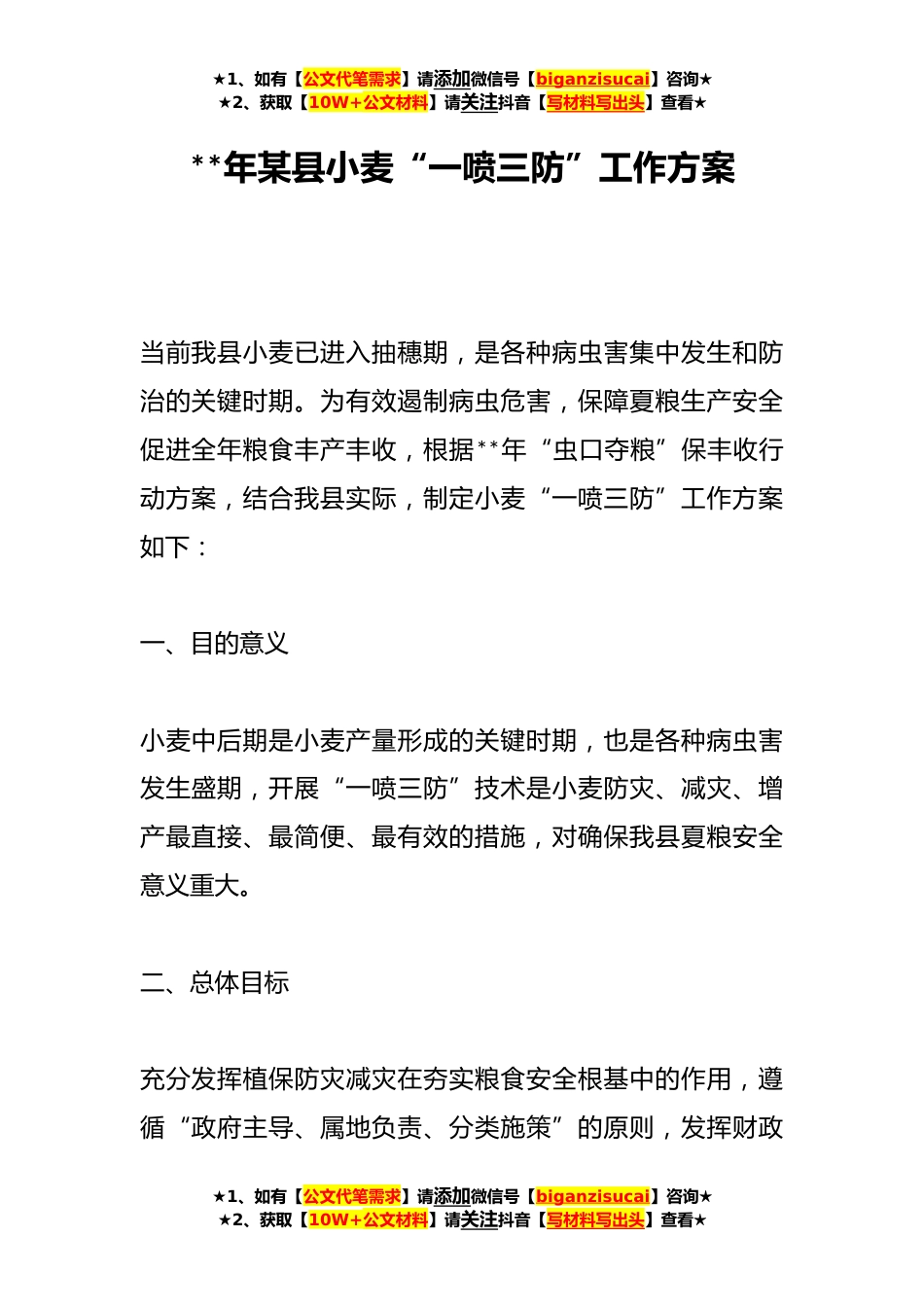★1、如有【公文代笔需求】请添加微信号【biganzisucai】咨询★★2、获取【10W+公文材料】请关注抖音【写材料写出头】查看★**年某县小麦“一喷三防”工作方案当前我县小麦已进入抽穗期,是各种病虫害集中发生和防治的关键时期。为有效遏制病虫危害,保障夏粮生产安全促进全年粮食丰产丰收,根据**年“虫口夺粮”保丰收行动方案,结合我县实际,制定小麦“一喷三防”工作方案如下:一、目的意义小麦中后期是小麦产量形成的关键时期,也是各种病虫害发生盛期,开展“一喷三防”技术是小麦防灾、减灾、增产最直接、最简便、最有效的措施,对确保我县夏粮安全意义重大。二、总体目标充分发挥植保防灾减灾在夯实粮食安全根基中的作用,遵循“政府主导、属地负责、分类施策”的原则,发挥财政★1、如有【公文代笔需求】...