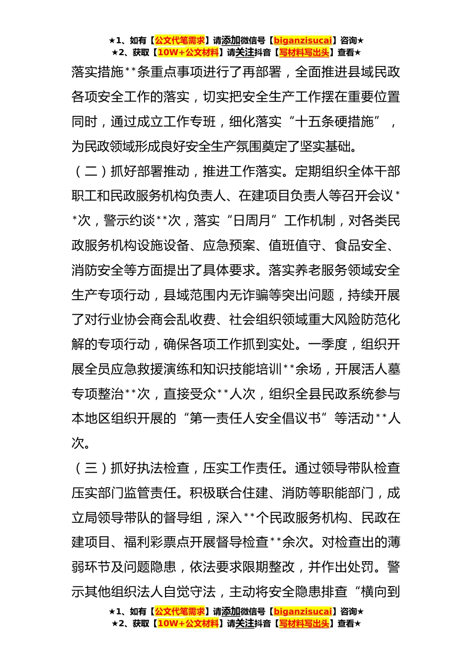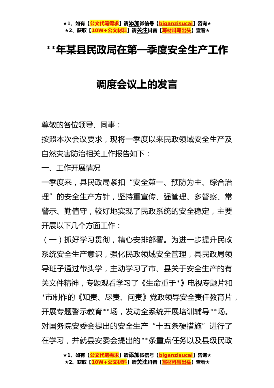 ★1、如有【公文代笔需求】请添加微信号【biganzisucai】咨询★★2、获取【10W+公文材料】请关注抖音【写材料写出头】查看★**年某县民政局在第一季度安全生产工作调度会议上的发言尊敬的各位领导、同事:按照本次会议要求,现将一季度以来民政领域安全生产及自然灾害防治相关工作报告如下:一、工作开展情况一季度来,县民政局紧扣“安全第一、预防为主、综合治理”的安全生产方针,坚持重宣传、强管理、多督察、常警示、勤值守,较好地实现了民政系统的安全稳定,主要开展以下几个方面工作:(一)抓好学习贯彻,精心安排部署。为进一步提升民政系统安全生产意识,强化民政领域安全管理,县民政局领导班子通过带头学,主动学习了市、县关于安全生产的有关文件精神,专题观看学习了《生命重于*》电视专题片和*市...
