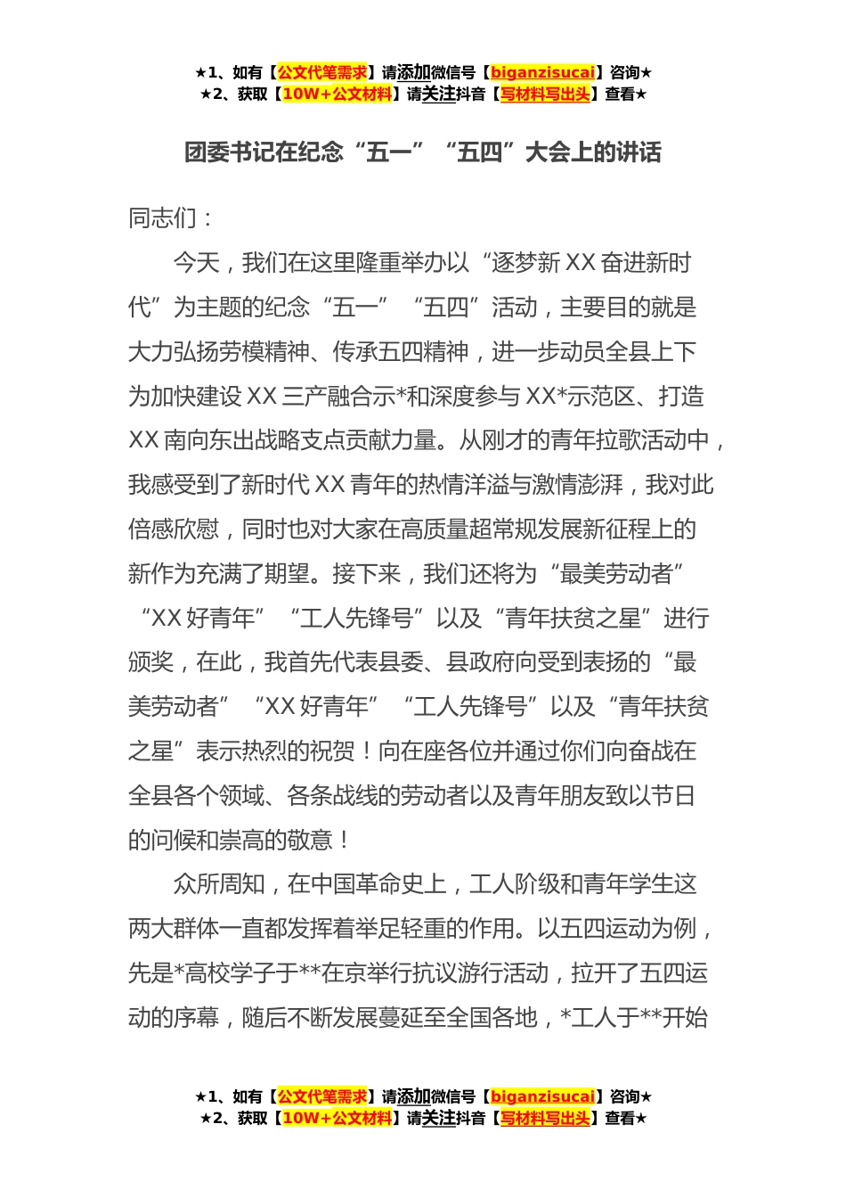 ★1、如有【公文代笔需求】请添加微信号【biganzisucai】咨询★★2、获取【10W+公文材料】请关注抖音【写材料写出头】查看★团委书记在纪念“五一”“五四”大会上的讲话同志们:今天,我们在这里隆重举办以“逐梦新XX奋进新时代”为主题的纪念“五一”“五四”活动,主要目的就是大力弘扬劳模精神、传承五四精神,进一步动员全县上下为加快建设XX三产融合示*和深度参与XX*示范区、打造XX南向东出战略支点贡献力量。从刚才的青年拉歌活动中,我感受到了新时代XX青年的热情洋溢与激情澎湃,我对此倍感欣慰,同时也对大家在高质量超常规发展新征程上的新作为充满了期望。接下来,我们还将为“最美劳动者”“XX好青年”“工人先锋号”以及“青年扶贫之星”进行颁奖,在此,我首先代表县委、县政府向受到表扬的“最美...