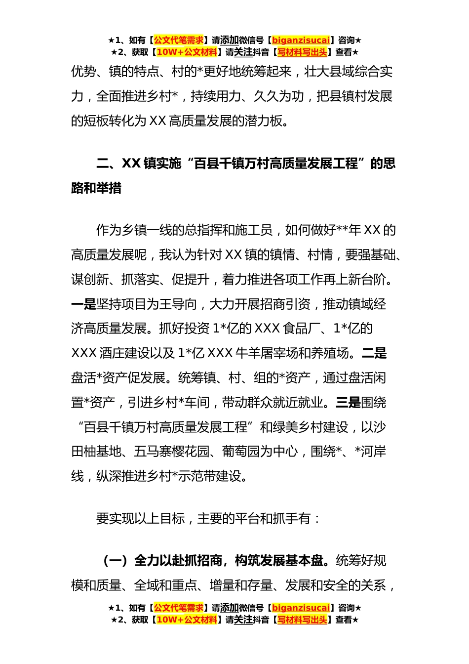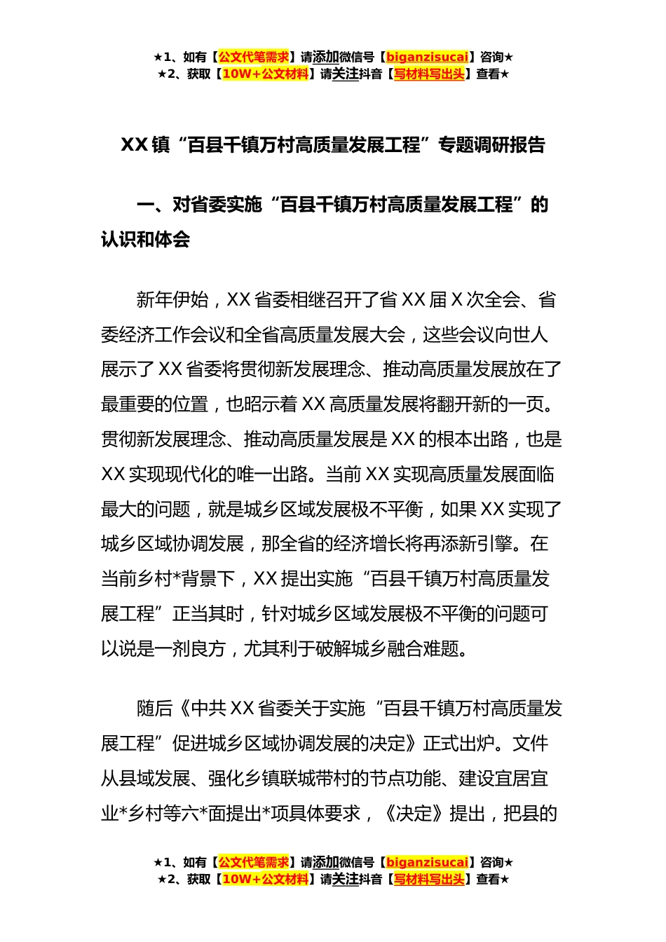 ★1、如有【公文代笔需求】请添加微信号【biganzisucai】咨询★★2、获取【10W+公文材料】请关注抖音【写材料写出头】查看★XX镇“百县千镇万村高质量发展工程”专题调研报告一、对省委实施“百县千镇万村高质量发展工程”的认识和体会新年伊始,XX省委相继召开了省XX届X次全会、省委经济工作会议和全省高质量发展大会,这些会议向世人展示了XX省委将贯彻新发展理念、推动高质量发展放在了最重要的位置,也昭示着XX高质量发展将翻开新的一页。贯彻新发展理念、推动高质量发展是XX的根本出路,也是XX实现现代化的唯一出路。当前XX实现高质量发展面临最大的问题,就是城乡区域发展极不平衡,如果XX实现了城乡区域协调发展,那全省的经济增长将再添新引擎。在当前乡村*背景下,XX提出实施“百县千镇万村高质量发展工...