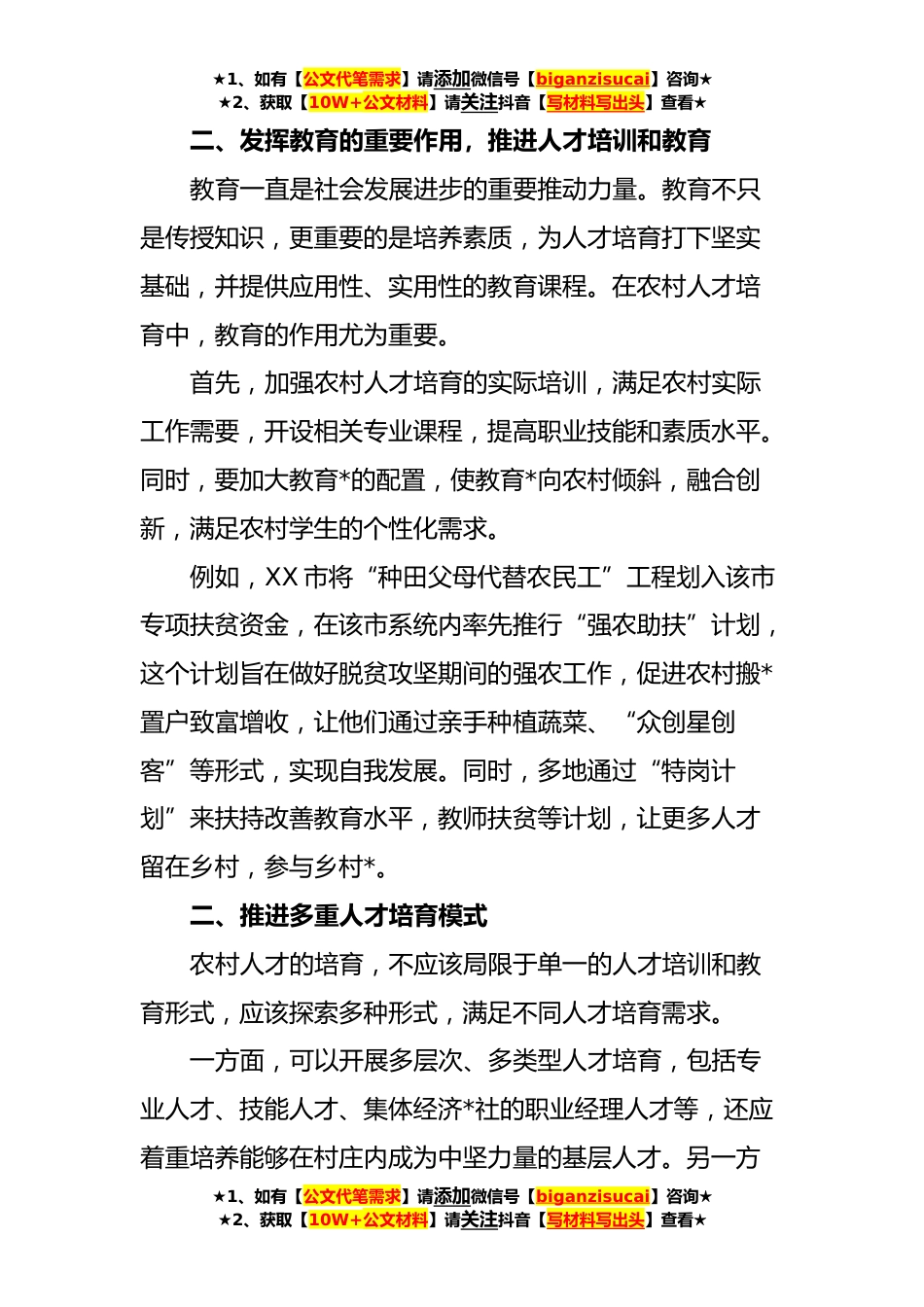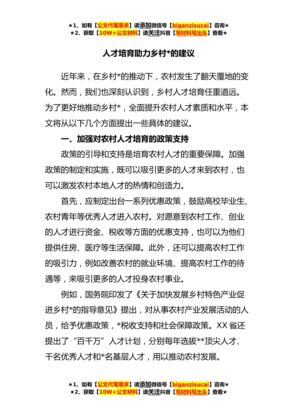 ★1、如有【公文代笔需求】请添加微信号【biganzisucai】咨询★★2、获取【10W+公文材料】请关注抖音【写材料写出头】查看★人才培育助力乡村*的建议近年来,在乡村*的推动下,农村发生了翻天覆地的变化。然而,我们也深刻认识到,乡村人才培育任重道远。为了更好地推动乡村*,全面提升农村人才素质和水平,本文将从以下几个方面提出一些具体的建议。一、加强对农村人才培育的政策支持政策的引导和支持是培育农村人才的重要保障。加强政策的制定和实施,既可以吸引更多的人才来到农村,也可以激发农村本地人才的热情和创造力。首先,应制定出台一系列优惠政策,鼓励高校毕业生、农村青年等优秀人才进入农村。对愿意到农村工作、创业的人才进行资金、税收等方面的优惠支持,也可以为他们提供住房、医疗等生活保障。...