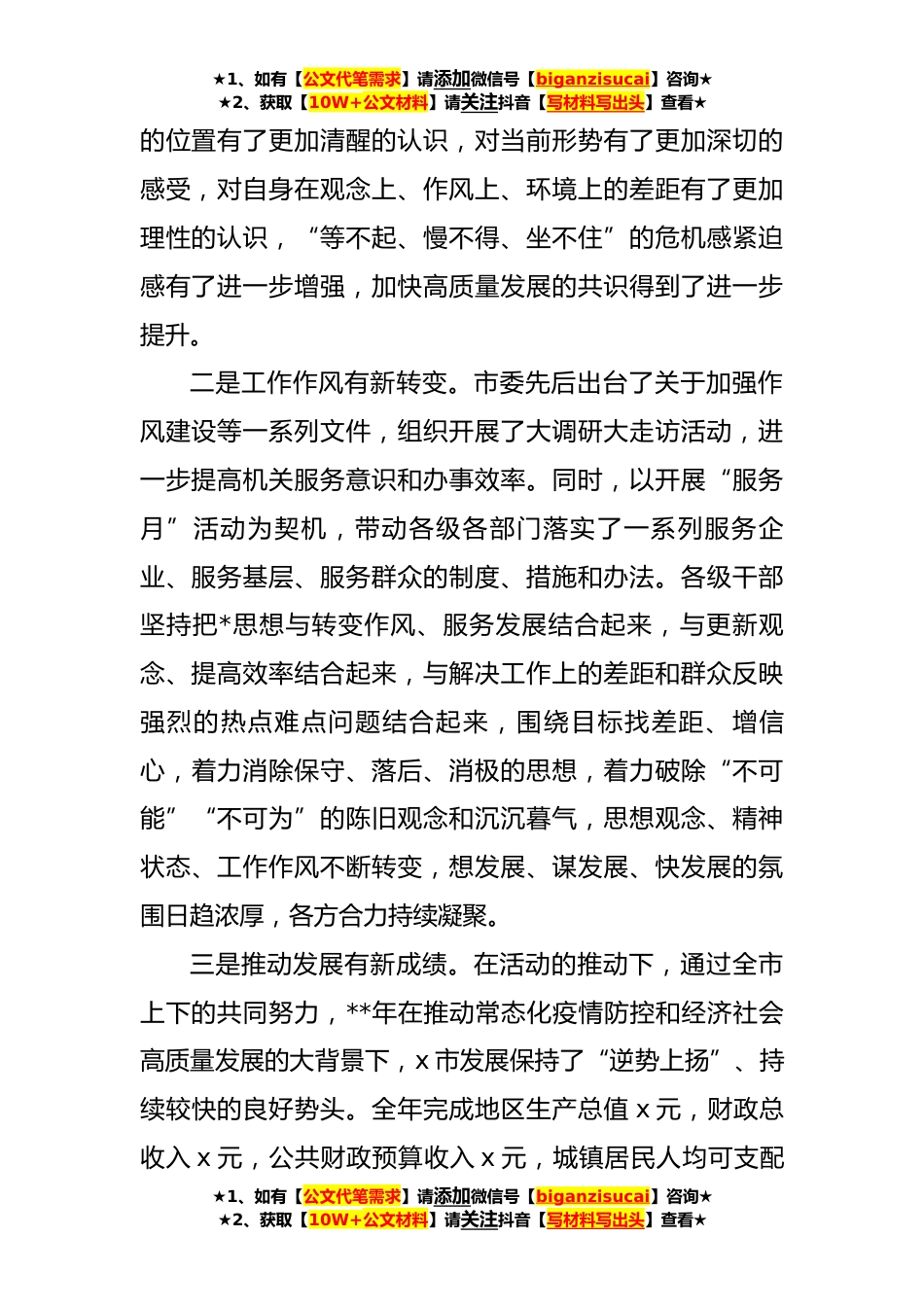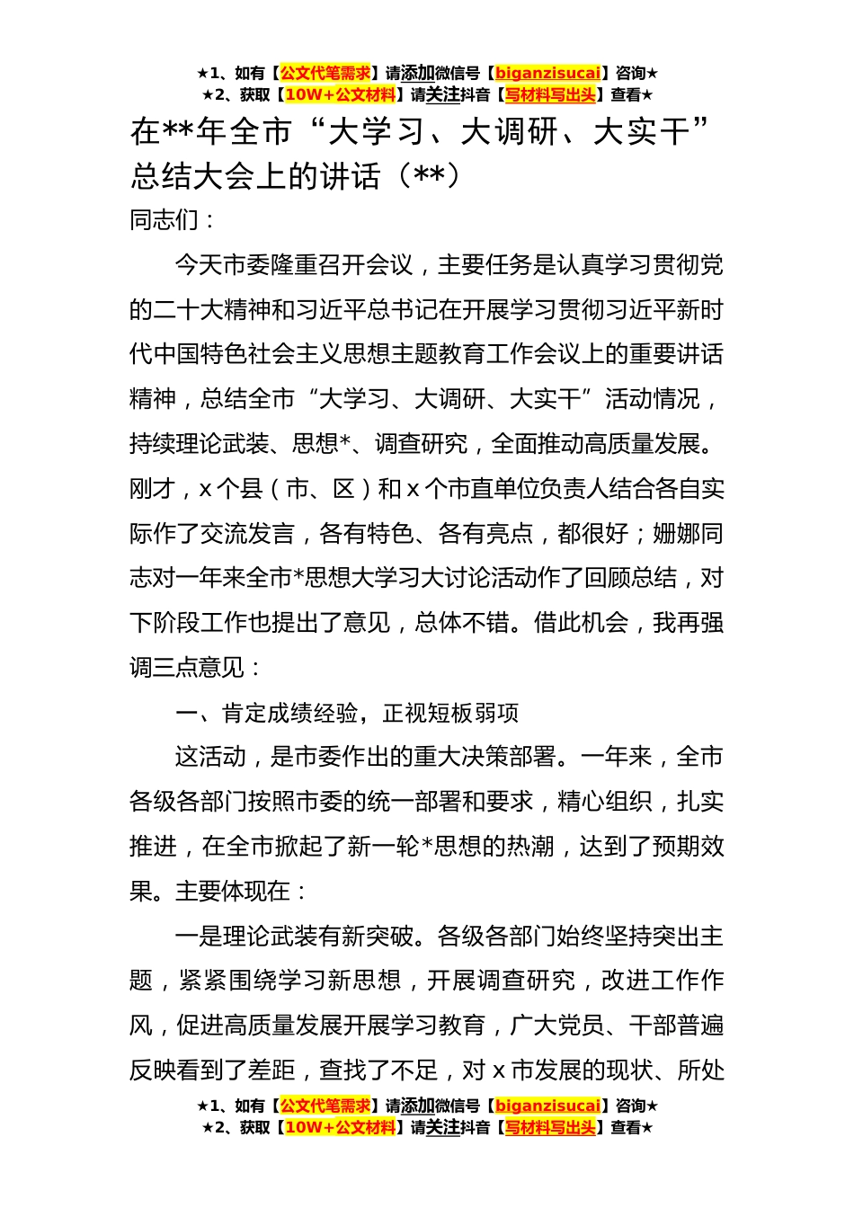 ★1、如有【公文代笔需求】请添加微信号【biganzisucai】咨询★★2、获取【10W+公文材料】请关注抖音【写材料写出头】查看★在**年全市“大学习、大调研、大实干”总结大会上的讲话(**)同志们:今天市委隆重召开会议,主要任务是认真学习贯彻党的二十大精神和习近平总书记在开展学习贯彻习近平新时代中国特色社会主义思想主题教育工作会议上的重要讲话精神,总结全市“大学习、大调研、大实干”活动情况,持续理论武装、思想*、调查研究,全面推动高质量发展。刚才,x个县(市、区)和x个市直单位负责人结合各自实际作了交流发言,各有特色、各有亮点,都很好;姗娜同志对一年来全市*思想大学习大讨论活动作了回顾总结,对下阶段工作也提出了意见,总体不错。借此机会,我再强调三点意见:一、肯定成绩经验,正...