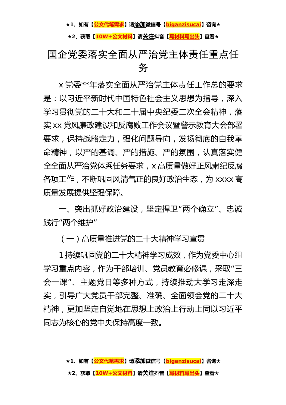 ★1、如有【公文代笔需求】请添加微信号【biganzisucai】咨询★★2、获取【10W+公文材料】请关注抖音【写材料写出头】查看★国企党委落实全面从严治党主体责任重点任务x党委**年落实全面从严治党主体责任工作总的要求是:以习近平新时代中国特色社会主义思想为指导,深入学习贯彻党的二十大和二十届中央纪委二次全会精神,落实xx党风廉政建设和反腐败工作会议暨警示教育大会部署要求,保持战略定力,强化问题导向,发扬彻底的自我革命精神,以严的基调、严的措施、严的氛围,认真落实健全全面从严治党体系任务要求,x高质量做好正风肃纪反腐各项工作,不断巩固风清气正的良好政治生态,为xxxx高质量发展提供坚强保障。“”一、突出抓好政治建设,坚定捍卫两个确立、忠诚“”践行两个维护(一)高质量推进党的二十...