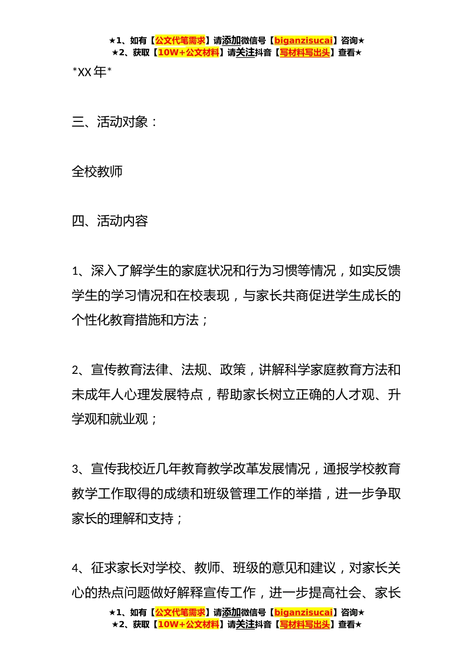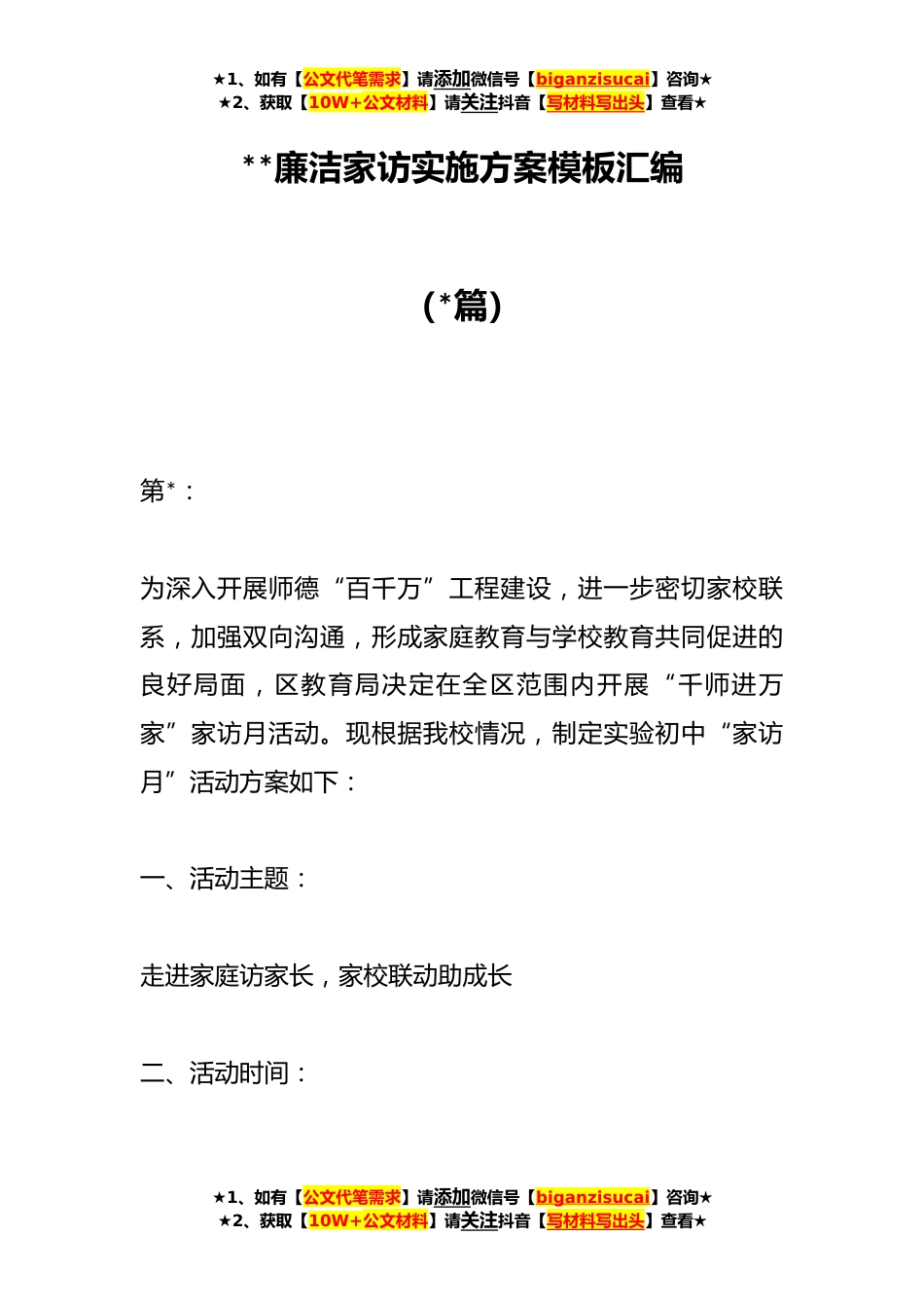 ★1、如有【公文代笔需求】请添加微信号【biganzisucai】咨询★★2、获取【10W+公文材料】请关注抖音【写材料写出头】查看★**廉洁家访实施方案模板汇编(*篇)第*:为深入开展师德“百千万”工程建设,进一步密切家校联系,加强双向沟通,形成家庭教育与学校教育共同促进的良好局面,区教育局决定在全区范围内开展“千师进万家”家访月活动。现根据我校情况,制定实验初中“家访月”活动方案如下:一、活动主题:走进家庭访家长,家校联动助成长二、活动时间:★1、如有【公文代笔需求】请添加微信号【biganzisucai】咨询★★2、获取【10W+公文材料】请关注抖音【写材料写出头】查看★★1、如有【公文代笔需求】请添加微信号【biganzisucai】咨询★★2、获取【10W+公文材料】请关注抖音【写材料写出头】查看★*XX...