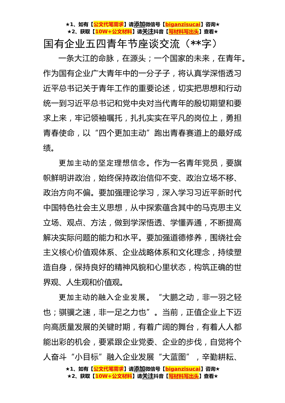 ★1、如有【公文代笔需求】请添加微信号【biganzisucai】咨询★★2、获取【10W+公文材料】请关注抖音【写材料写出头】查看★国有企业五四青年节座谈交流(**字)一条大江的命脉,在源头;一个国家的未来,在青年。作为国有企业广大青年中的一分子子,将认真学深悟透习近平总书记关于青年工作的重要论述,切实把思想和行动统一到习近平总书记和党中央对当代青年的殷切期望和要求上来,牢记领袖嘱托,扎扎实实在平凡的岗位上,勇担青春使命,以“四个更加主动”跑出青春赛道上的最好成绩。更加主动的坚定理想信念。作为一名青年党员,要旗帜鲜明讲政治,始终保持政治信仰不变、政治立场不移、政治方向不偏。要加强理论学习,深入学习习近平新时代中国特色社会主义思想,从中探索蕴含其中的马克思主义立场、观点、方...