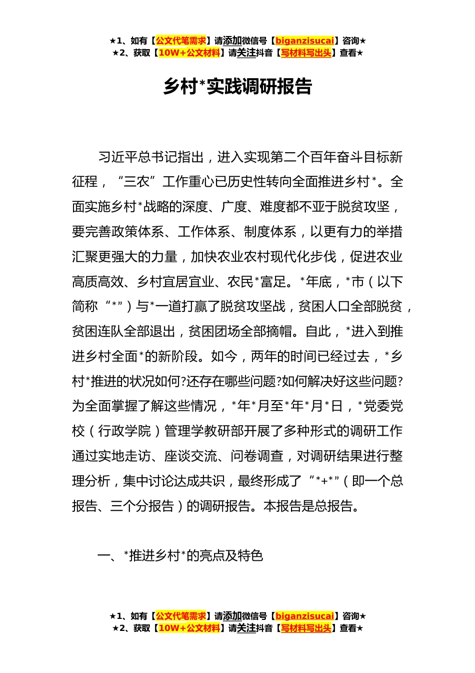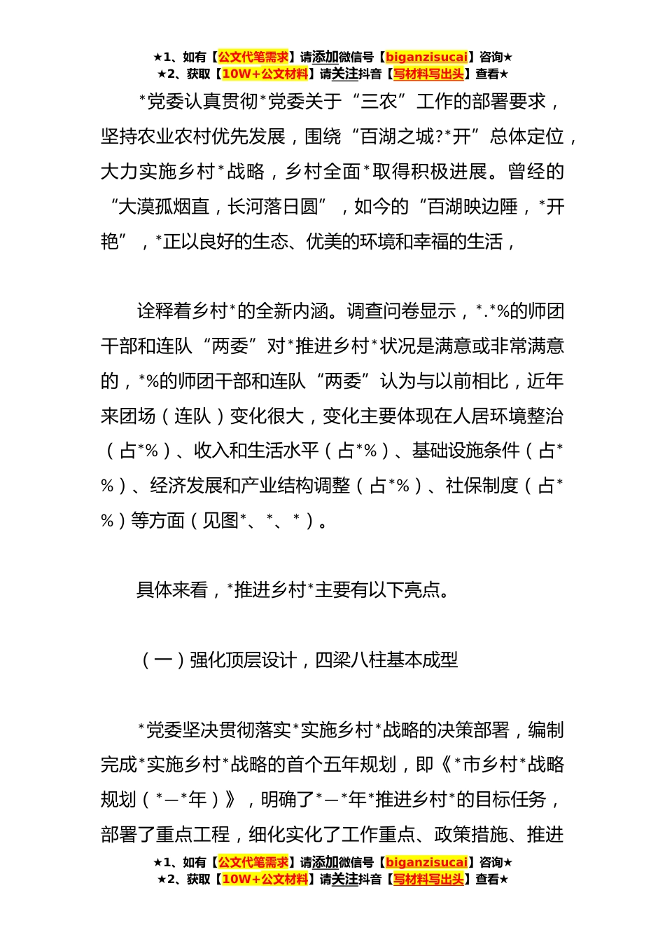 ★1、如有【公文代笔需求】请添加微信号【biganzisucai】咨询★★2、获取【10W+公文材料】请关注抖音【写材料写出头】查看★乡村*实践调研报告习近平总书记指出,进入实现第二个百年奋斗目标新征程,“三农”工作重心已历史性转向全面推进乡村*。全面实施乡村*战略的深度、广度、难度都不亚于脱贫攻坚,要完善政策体系、工作体系、制度体系,以更有力的举措汇聚更强大的力量,加快农业农村现代化步伐,促进农业高质高效、乡村宜居宜业、农民*富足。*年底,*市(以下简称“*”)与*一道打赢了脱贫攻坚战,贫困人口全部脱贫,贫困连队全部退出,贫困团场全部摘帽。自此,*进入到推进乡村全面*的新阶段。如今,两年的时间已经过去,*乡村*推进的状况如何?还存在哪些问题?如何解决好这些问题?为全面掌握了解这些情况,...