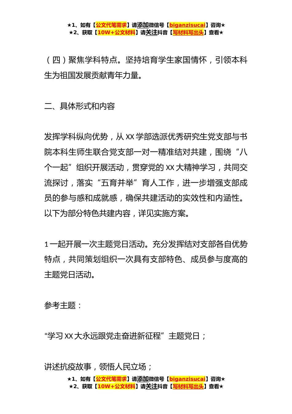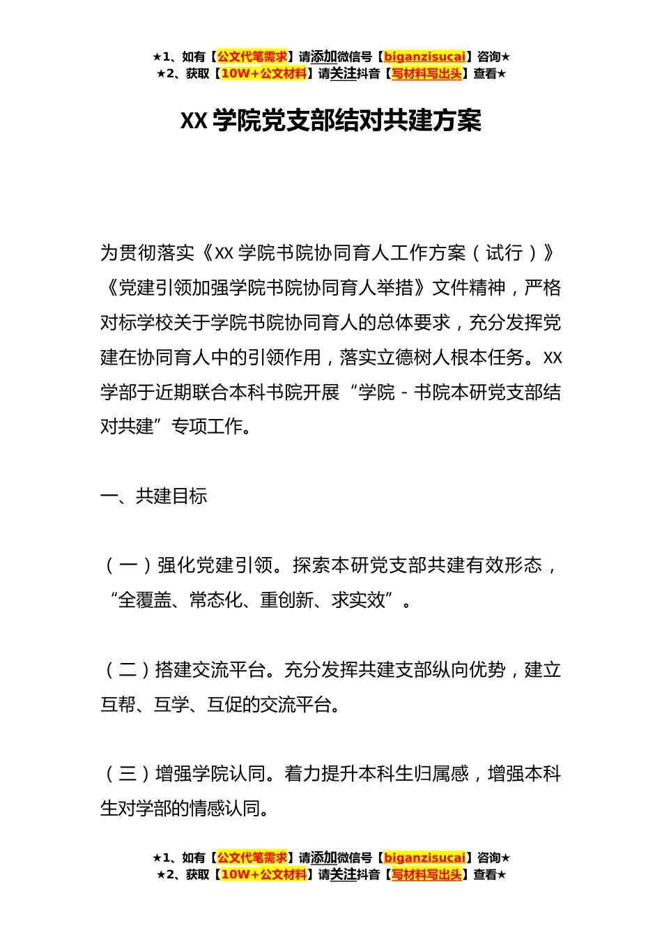 ★1、如有【公文代笔需求】请添加微信号【biganzisucai】咨询★★2、获取【10W+公文材料】请关注抖音【写材料写出头】查看★XX学院党支部结对共建方案为贯彻落实《XX学院书院协同育人工作方案(试行)》《党建引领加强学院书院协同育人举措》文件精神,严格对标学校关于学院书院协同育人的总体要求,充分发挥党建在协同育人中的引领作用,落实立德树人根本任务。XX学部于近期联合本科书院开展“学院-书院本研党支部结对共建”专项工作。一、共建目标(一)强化党建引领。探索本研党支部共建有效形态,“全覆盖、常态化、重创新、求实效”。(二)搭建交流平台。充分发挥共建支部纵向优势,建立互帮、互学、互促的交流平台。(三)增强学院认同。着力提升本科生归属感,增强本科生对学部的情感认同。★1、如有【公...