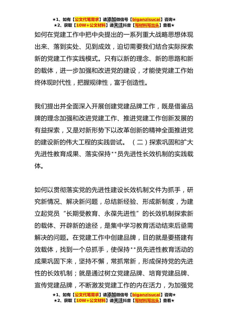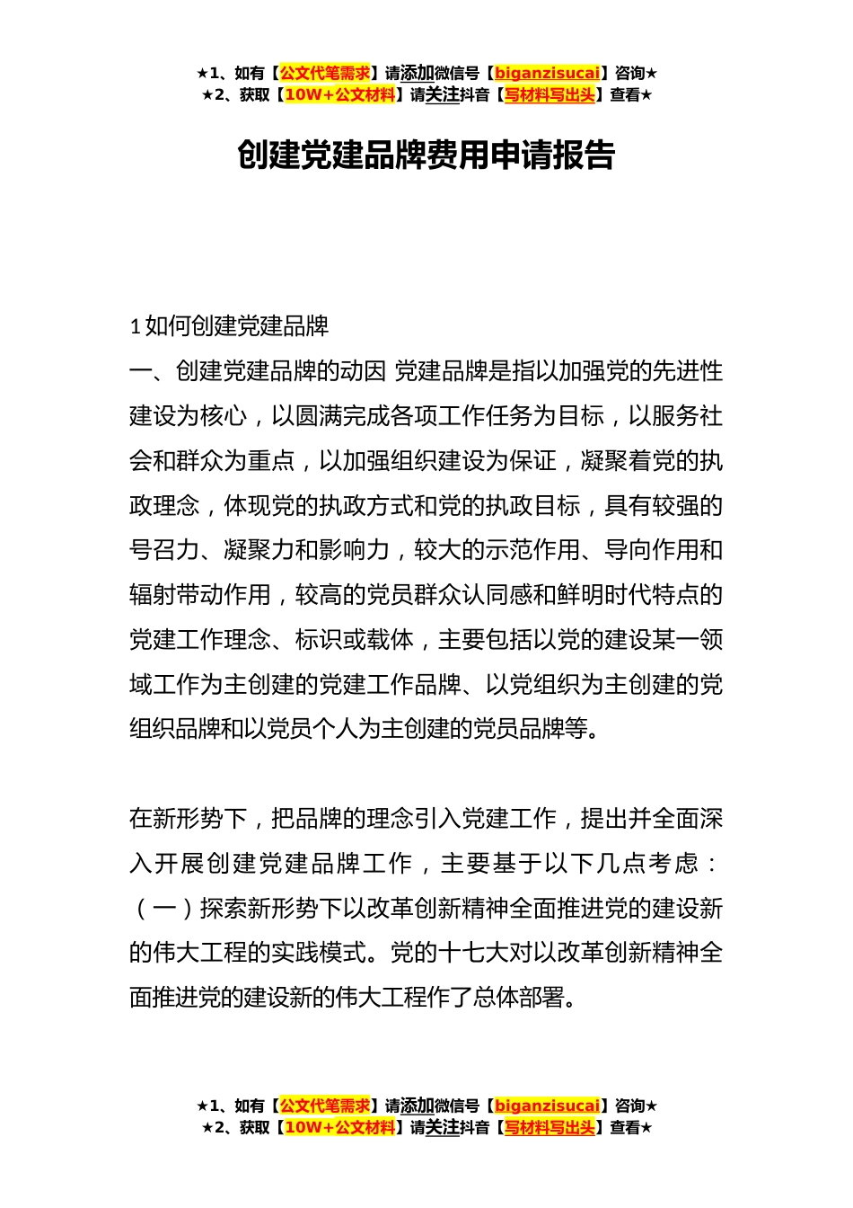 ★1、如有【公文代笔需求】请添加微信号【biganzisucai】咨询★★2、获取【10W+公文材料】请关注抖音【写材料写出头】查看★创建党建品牌费用申请报告1如何创建党建品牌一、创建党建品牌的动因党建品牌是指以加强党的先进性建设为核心,以圆满完成各项工作任务为目标,以服务社会和群众为重点,以加强组织建设为保证,凝聚着党的执政理念,体现党的执政方式和党的执政目标,具有较强的号召力、凝聚力和影响力,较大的示范作用、导向作用和辐射带动作用,较高的党员群众认同感和鲜明时代特点的党建工作理念、标识或载体,主要包括以党的建设某一领域工作为主创建的党建工作品牌、以党组织为主创建的党组织品牌和以党员个人为主创建的党员品牌等。在新形势下,把品牌的理念引入党建工作,提出并全面深入开展创建党建...