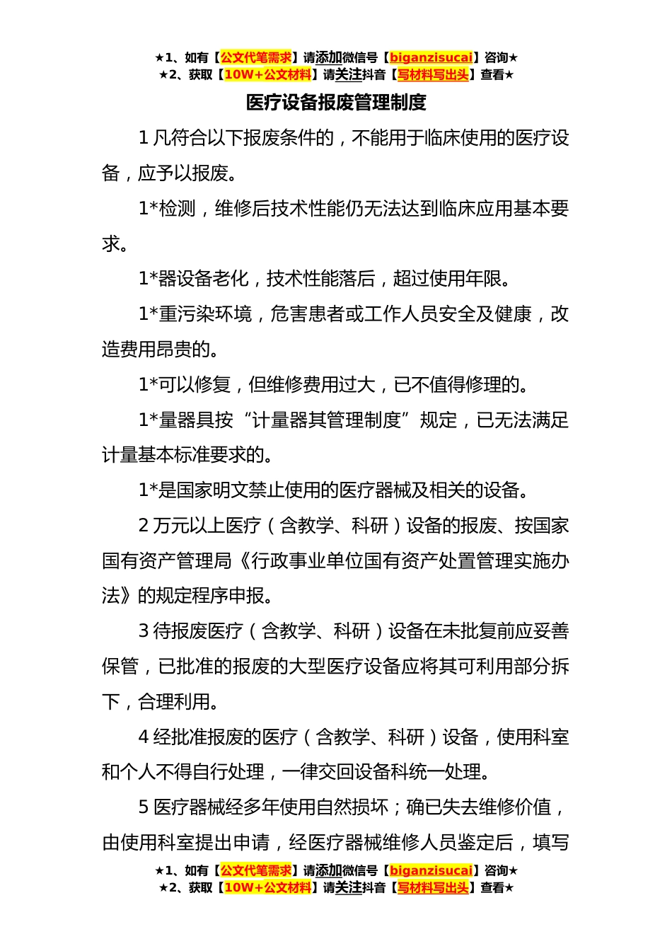 ★1、如有【公文代笔需求】请添加微信号【biganzisucai】咨询★★2、获取【10W+公文材料】请关注抖音【写材料写出头】查看★医疗设备报废管理制度1凡符合以下报废条件的,不能用于临床使用的医疗设备,应予以报废。1*检测,维修后技术性能仍无法达到临床应用基本要求。1*器设备老化,技术性能落后,超过使用年限。1*重污染环境,危害患者或工作人员安全及健康,改造费用昂贵的。1*可以修复,但维修费用过大,已不值得修理的。1*量器具按“计量器其管理制度”规定,已无法满足计量基本标准要求的。1*是国家明文禁止使用的医疗器械及相关的设备。2万元以上医疗(含教学、科研)设备的报废、按国家国有资产管理局《行政事业单位国有资产处置管理实施办法》的规定程序申报。3待报废医疗(含教学、科研)设备在未批复前...