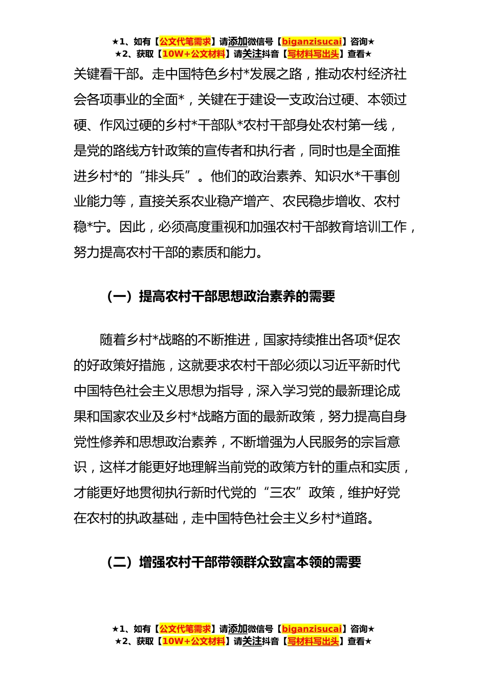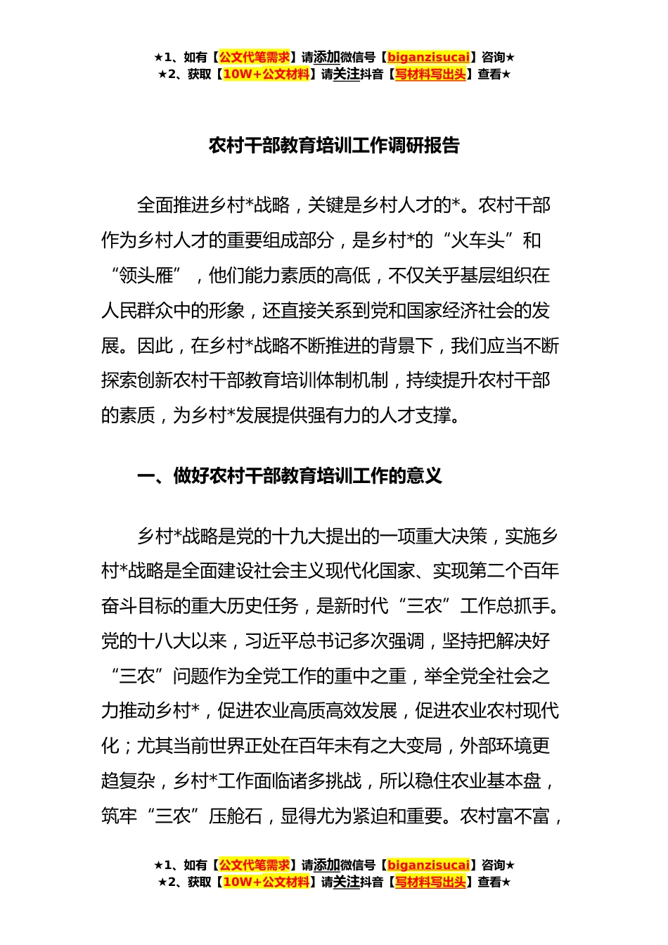 ★1、如有【公文代笔需求】请添加微信号【biganzisucai】咨询★★2、获取【10W+公文材料】请关注抖音【写材料写出头】查看★农村干部教育培训工作调研报告全面推进乡村*战略,关键是乡村人才的*。农村干部作为乡村人才的重要组成部分,是乡村*的“火车头”和“领头雁”,他们能力素质的高低,不仅关乎基层组织在人民群众中的形象,还直接关系到党和国家经济社会的发展。因此,在乡村*战略不断推进的背景下,我们应当不断探索创新农村干部教育培训体制机制,持续提升农村干部的素质,为乡村*发展提供强有力的人才支撑。一、做好农村干部教育培训工作的意义乡村*战略是党的十九大提出的一项重大决策,实施乡村*战略是全面建设社会主义现代化国家、实现第二个百年奋斗目标的重大历史任务,是新时代“三农”工作总抓手...