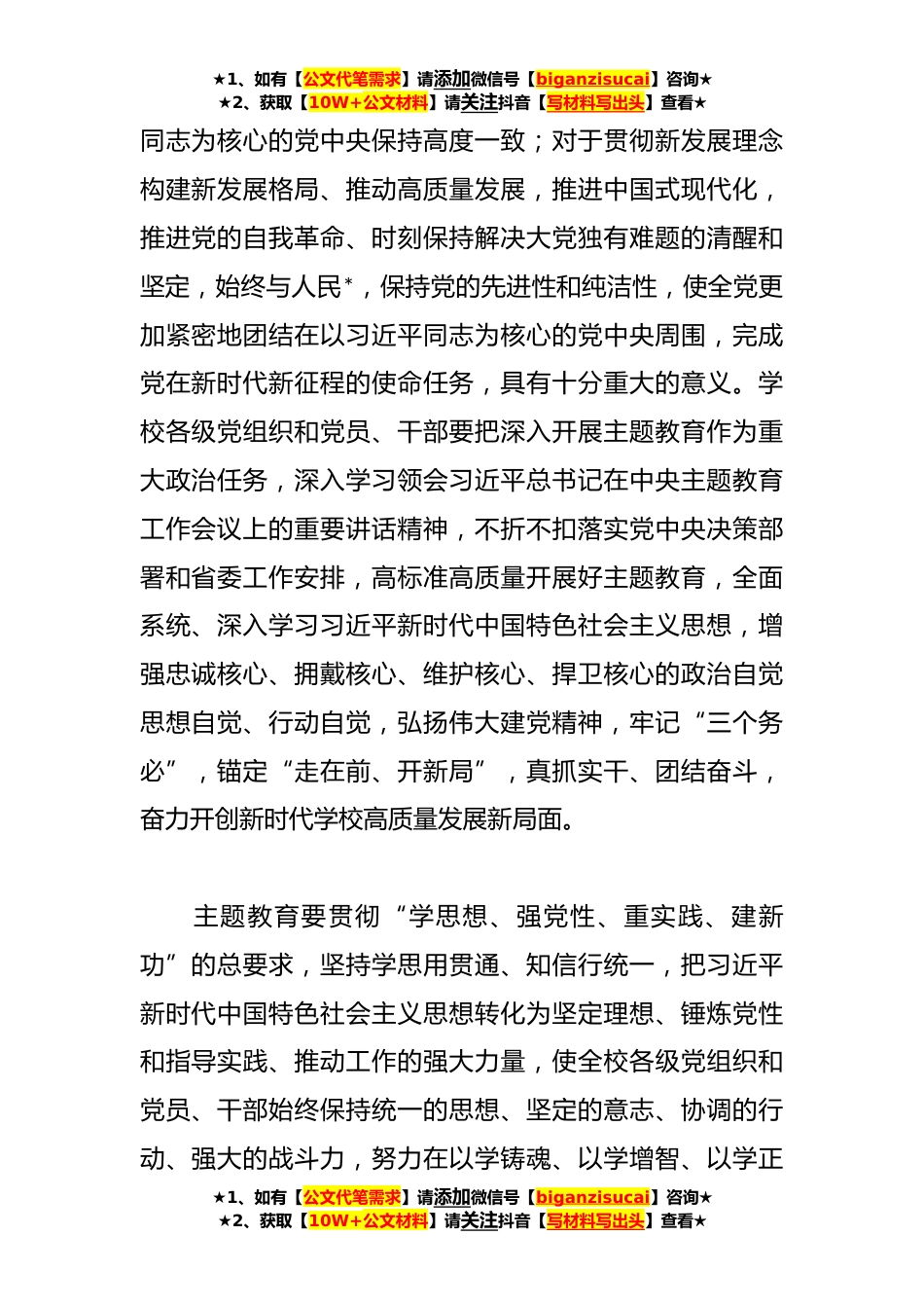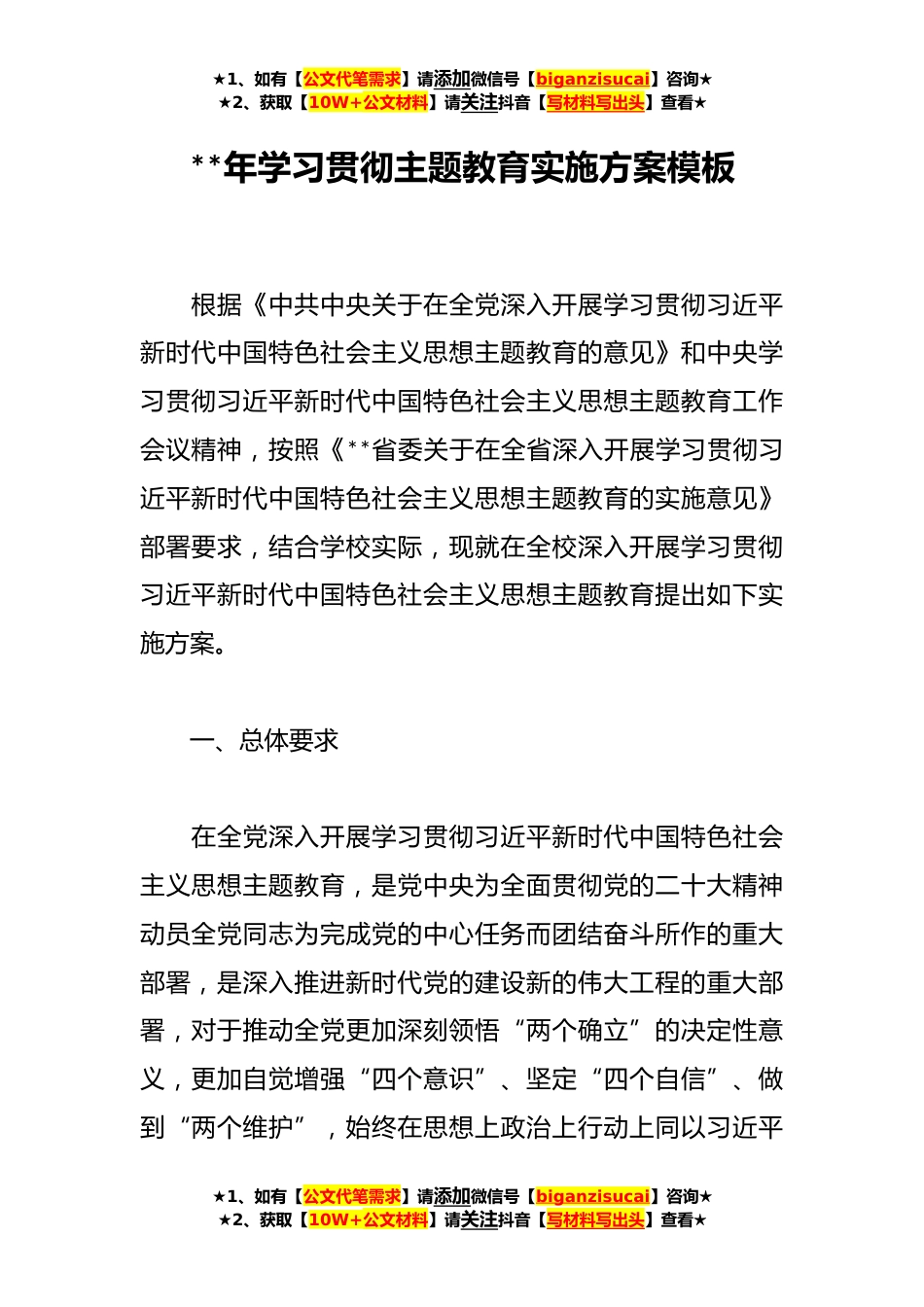 ★1、如有【公文代笔需求】请添加微信号【biganzisucai】咨询★★2、获取【10W+公文材料】请关注抖音【写材料写出头】查看★**年学习贯彻主题教育实施方案模板根据《中共中央关于在全党深入开展学习贯彻习近平新时代中国特色社会主义思想主题教育的意见》和中央学习贯彻习近平新时代中国特色社会主义思想主题教育工作会议精神,按照《**省委关于在全省深入开展学习贯彻习近平新时代中国特色社会主义思想主题教育的实施意见》部署要求,结合学校实际,现就在全校深入开展学习贯彻习近平新时代中国特色社会主义思想主题教育提出如下实施方案。一、总体要求在全党深入开展学习贯彻习近平新时代中国特色社会主义思想主题教育,是党中央为全面贯彻党的二十大精神动员全党同志为完成党的中心任务而团结奋斗所作的重大部...