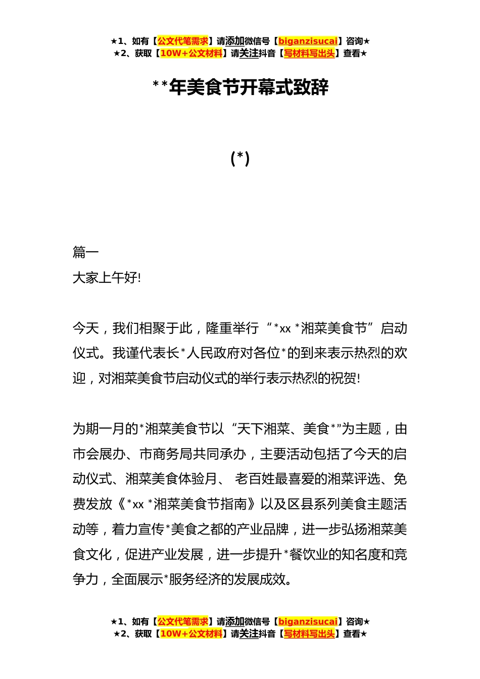 ★1、如有【公文代笔需求】请添加微信号【biganzisucai】咨询★★2、获取【10W+公文材料】请关注抖音【写材料写出头】查看★**年美食节开幕式致辞(*)篇一大家上午好!今天,我们相聚于此,隆重举行“*xx*湘菜美食节”启动仪式。我谨代表长*人民政府对各位*的到来表示热烈的欢迎,对湘菜美食节启动仪式的举行表示热烈的祝贺!为期一月的*湘菜美食节以“天下湘菜、美食*”为主题,由市会展办、市商务局共同承办,主要活动包括了今天的启动仪式、湘菜美食体验月、老百姓最喜爱的湘菜评选、免费发放《*xx*湘菜美食节指南》以及区县系列美食主题活动等,着力宣传*美食之都的产业品牌,进一步弘扬湘菜美食文化,促进产业发展,进一步提升*餐饮业的知名度和竞争力,全面展示*服务经济的发展成效。★1、如有【公文代笔需求】...