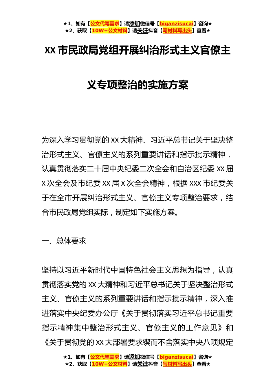★1、如有【公文代笔需求】请添加微信号【biganzisucai】咨询★★2、获取【10W+公文材料】请关注抖音【写材料写出头】查看★XX市民政局党组开展纠治形式主义官僚主义专项整治的实施方案为深入学习贯彻党的XX大精神、习近平总书记关于坚决整治形式主义、官僚主义的系列重要讲话和指示批示精神,认真贯彻落实二十届中央纪委二次全会和自治区纪委XX届X次全会及市纪委XX届X次全会精神,根据XXX市纪委关于在全市开展纠治形式主义、官僚主义专项整治要求,结合市民政局党组实际,制定如下实施方案。一、总体要求坚持以习近平新时代中国特色社会主义思想为指导,认真贯彻落实党的XX大精神和习近平总书记关于坚决整治形式主义、官僚主义的系列重要讲话和指示批示精神,深入推进落实中央纪委办公厅《关于贯彻落实习近平总书...