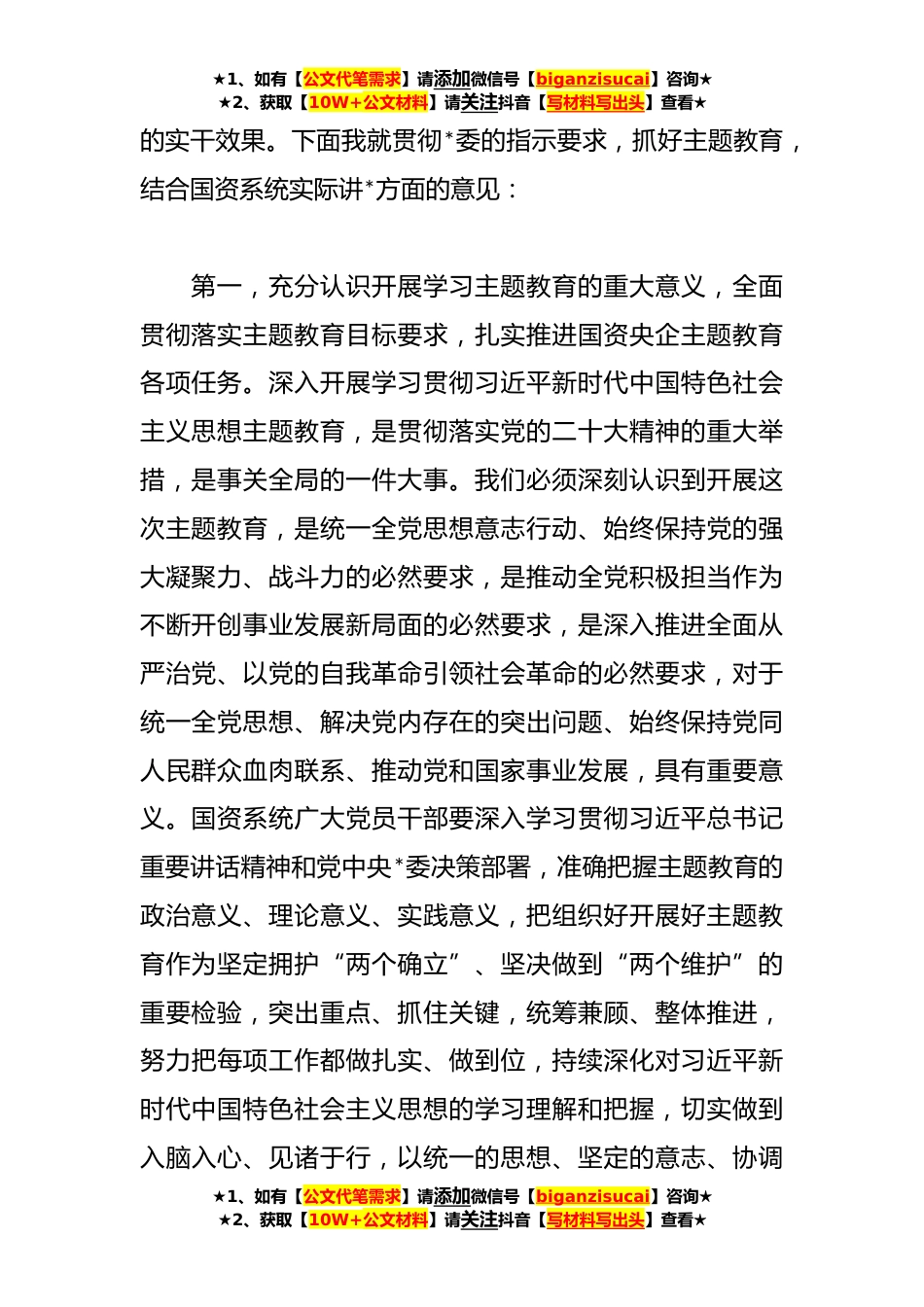 ★1、如有【公文代笔需求】请添加微信号【biganzisucai】咨询★★2、获取【10W+公文材料】请关注抖音【写材料写出头】查看★在**年主题教育动员部署会上的讲话稿同志们:按照主题教育计划安排,今天我们召开动员部署会,目的是统一思想、凝聚共识,明确任务,落实工作。习近平总书记的重要讲话,深刻阐述开展主题教育的重大意义和目标要求,对主题教育各项工作作出全面部署,为全党开展主题教育提供了根本遵循。我们要持续深入学习,深刻领会开展主题教育是统一全党思想意志行动、始终保持党的强大凝聚力战斗力的必然要求,是坚持用习近平新时代中国特色社会主义思想武装国资国企的迫切需要,是做强做优做大国有资本和国有企业,推动国企高质量发展的迫切需要;是国资央企以高质量党建引领保障高质量发展的迫切需...