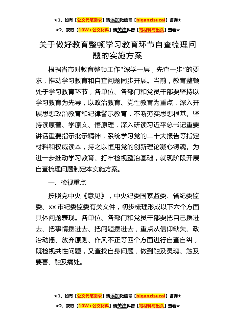 ★1、如有【公文代笔需求】请添加微信号【biganzisucai】咨询★★2、获取【10W+公文材料】请关注抖音【写材料写出头】查看★关于做好教育整顿学习教育环节自查梳理问题的实施方案“”根据省市对教育整顿工作深学一层,先查一步的要求,推动学习教育和自查问题同步开展。当前,教育整顿处于学习教育环节,各单位、各部门和党员干部要坚持以学习教育为先导,以政治教育、党性教育为重点,深入开展思想政治教育和纪律警示教育,不断夯实思想根基。坚持读原著、学原文、悟原理,深入研读习近平总书记重要讲话重要指示批示精神,系统学习党的二十大报告等指定材料和权威读本,持之以恒用党的创新理论凝心铸魂。为进一步推动学习教育、打牢检视整治基础,就现阶段开展自查梳理问题制定本实施方案。一、检视重点按照党中...