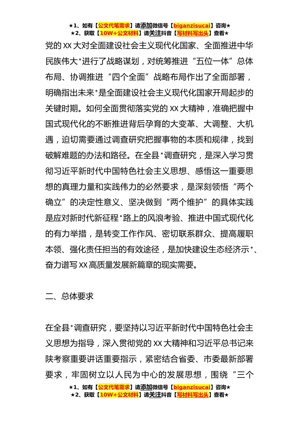 ★1、如有【公文代笔需求】请添加微信号【biganzisucai】咨询★★2、获取【10W+公文材料】请关注抖音【写材料写出头】查看★XX县年度*调查研究实施方案为深入学习贯彻习近平新时代中国特色社会主义思想,全面贯彻落实党的XX大精神,根据中央办公厅《关于在全党*调查研究的工作方案》要求,县委决定在全县范围*调查研究,现制定如下实施方案。一、目的意义*调查研究,是党中央的重大决策部署。党的十八大以来,以习近平同志为核心的党中央高度重视调查研究工作,习近平总书记强调指出,调查研究是谋事之基、成事之道,没有调查就没有发言权,没有调查就没有决策权;正确的决策离不开调查研究,正确的贯彻落实同样也离不开调查研究;调查研究是获得真知灼见的源头活水,是做好工作的基本功;要在全党*调查研究之风。...