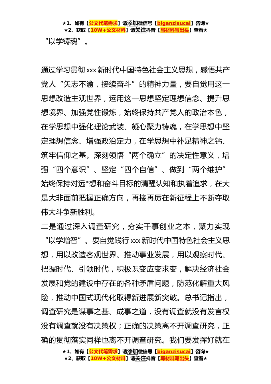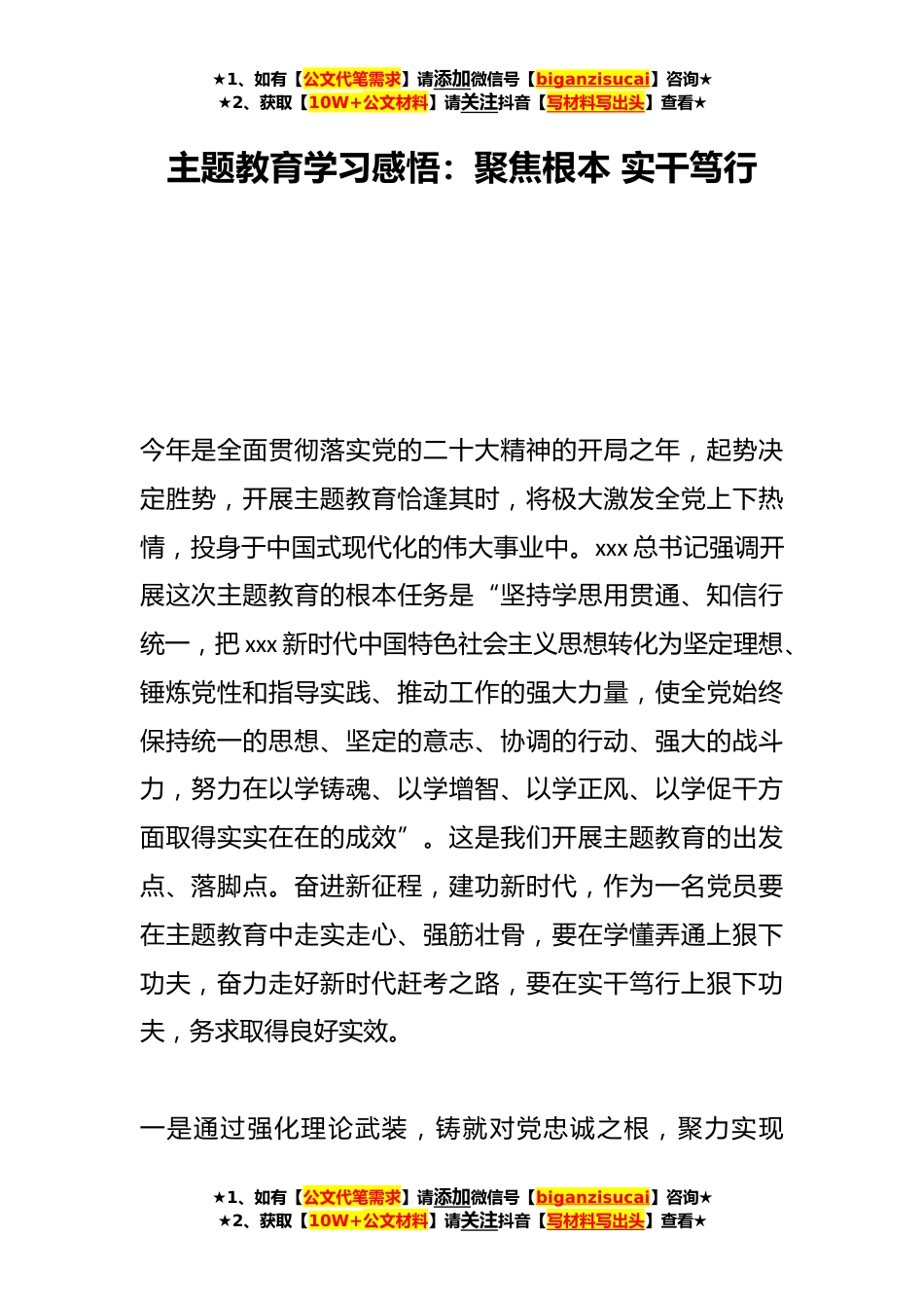 ★1、如有【公文代笔需求】请添加微信号【biganzisucai】咨询★★2、获取【10W+公文材料】请关注抖音【写材料写出头】查看★主题教育学习感悟:聚焦根本实干笃行今年是全面贯彻落实党的二十大精神的开局之年,起势决定胜势,开展主题教育恰逢其时,将极大激发全党上下热情,投身于中国式现代化的伟大事业中。xxx总书记强调开展这次主题教育的根本任务是“坚持学思用贯通、知信行统一,把xxx新时代中国特色社会主义思想转化为坚定理想、锤炼党性和指导实践、推动工作的强大力量,使全党始终保持统一的思想、坚定的意志、协调的行动、强大的战斗力,努力在以学铸魂、以学增智、以学正风、以学促干方面取得实实在在的成效”。这是我们开展主题教育的出发点、落脚点。奋进新征程,建功新时代,作为一名党员要在主题教...