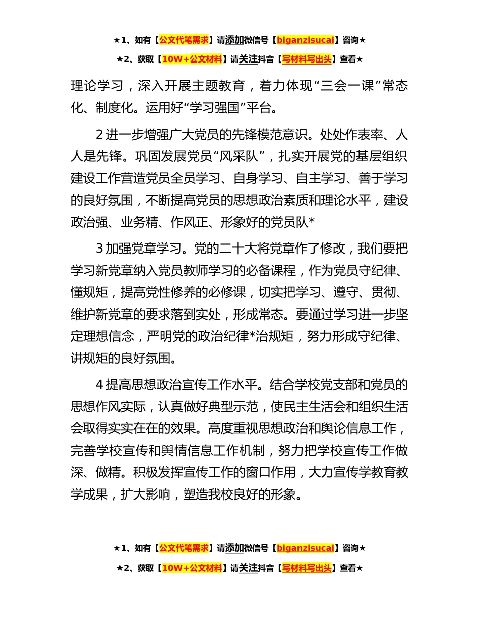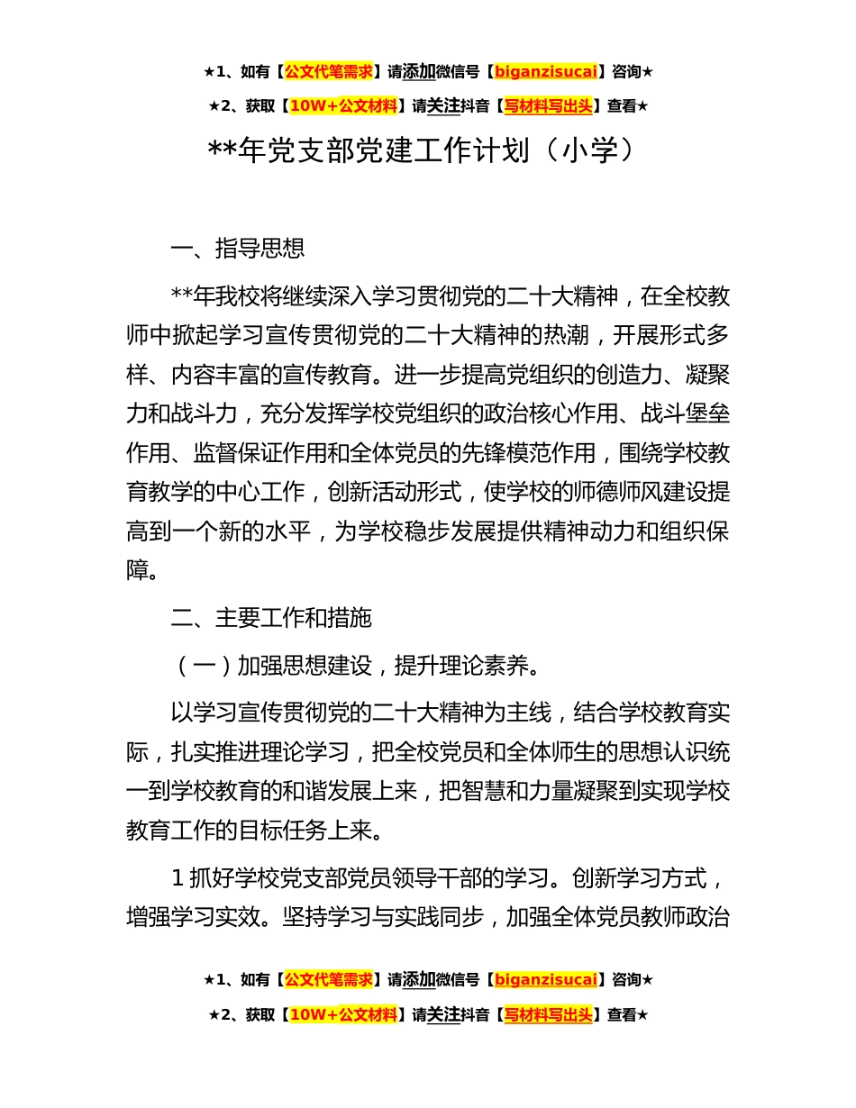 ★1、如有【公文代笔需求】请添加微信号【biganzisucai】咨询★★2、获取【10W+公文材料】请关注抖音【写材料写出头】查看★**年党支部党建工作计划(小学)一、指导思想**年我校将继续深入学习贯彻党的二十大精神,在全校教师中掀起学习宣传贯彻党的二十大精神的热潮,开展形式多样、内容丰富的宣传教育。进一步提高党组织的创造力、凝聚力和战斗力,充分发挥学校党组织的政治核心作用、战斗堡垒作用、监督保证作用和全体党员的先锋模范作用,围绕学校教育教学的中心工作,创新活动形式,使学校的师德师风建设提高到一个新的水平,为学校稳步发展提供精神动力和组织保障。二、主要工作和措施(一)加强思想建设,提升理论素养。以学习宣传贯彻党的二十大精神为主线,结合学校教育实际,扎实推进理论学习,把全校...
