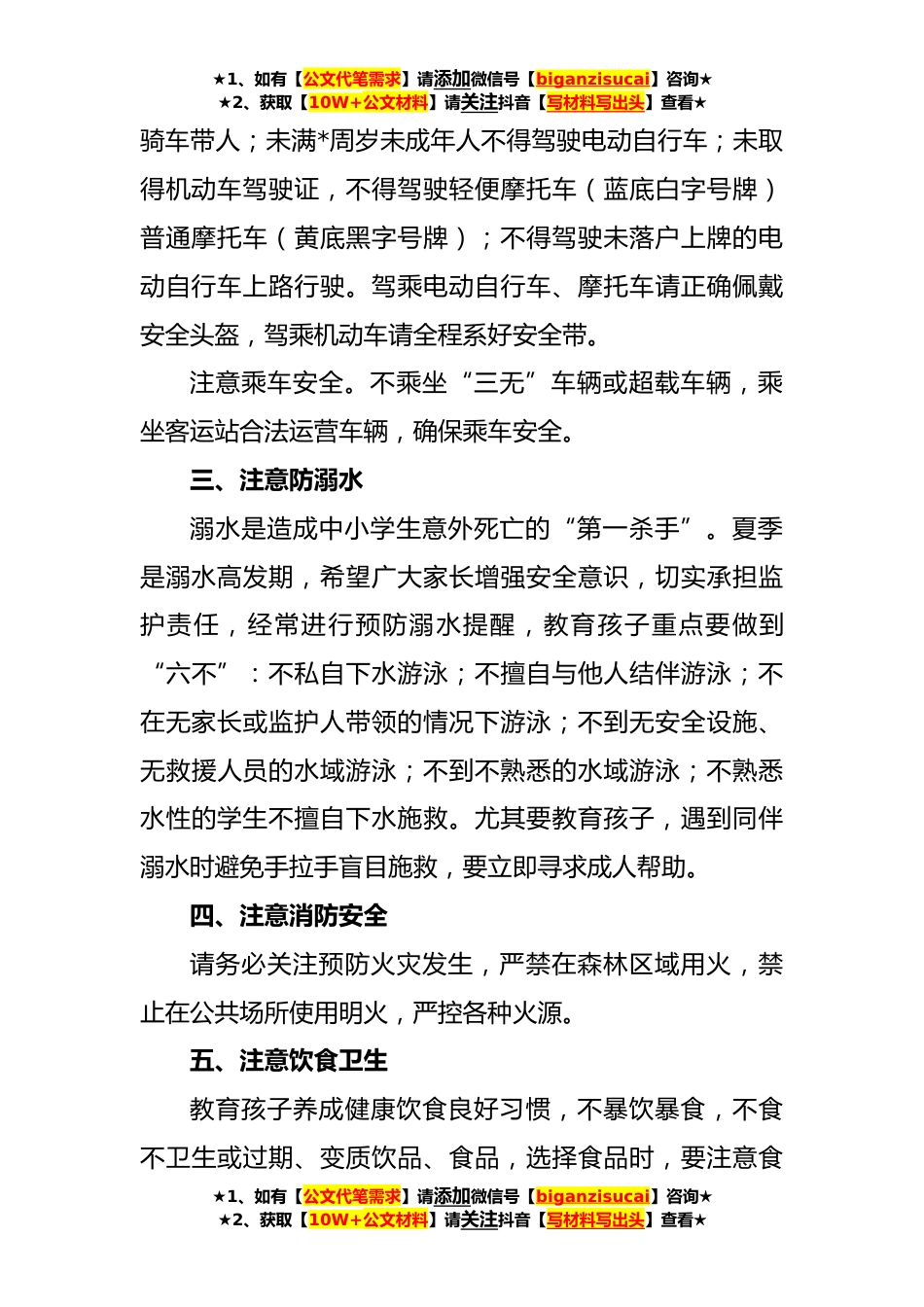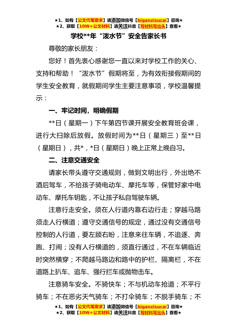 ★1、如有【公文代笔需求】请添加微信号【biganzisucai】咨询★★2、获取【10W+公文材料】请关注抖音【写材料写出头】查看★学校**年“泼水节”安全告家长书尊敬的家长朋友:您好!首先衷心感谢您一直以来对学校工作的关心、支持和帮助!“泼水节”假期将至,为有效衔接假期间的学生安全教育,就假期间学生主要注意事项,学校温馨提示:一、牢记时间,明确假期**日(星期一)下午第四节课开展安全教育班会课,进行大扫除后放假。放假时间为**日(星期三)至**日(星期日),共*,*日(星期日)晚上正常上晚自习。二、注意交通安全请家长带头遵守交通规则,做到文明出行,外出绝不酒后驾车,不给孩子骑电动车、摩托车等,保管好家中电动车、摩托车钥匙,不让孩子私自驾驶车辆。注意行走安全。须在人行道内靠右边行...