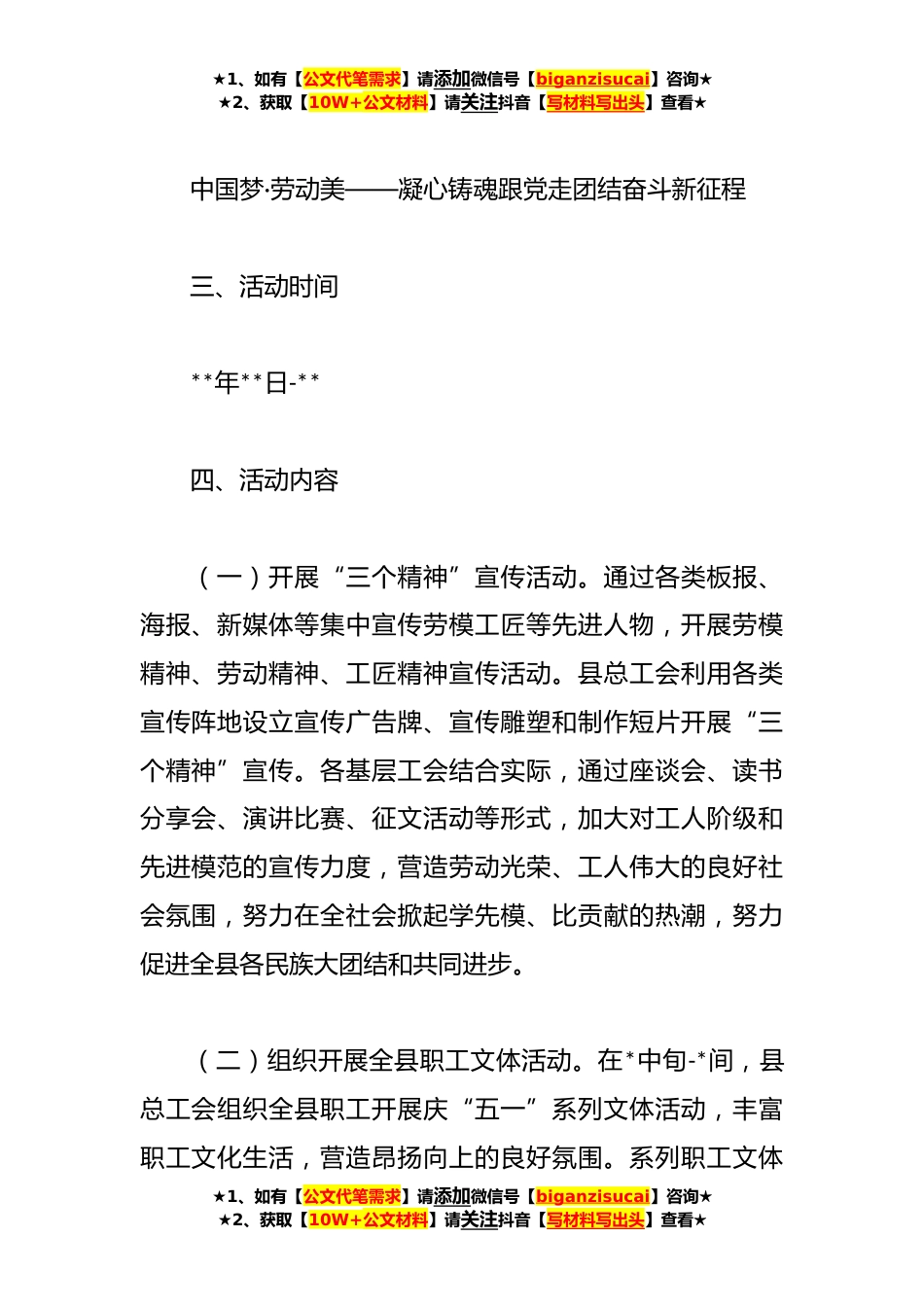 ★1、如有【公文代笔需求】请添加微信号【biganzisucai】咨询★★2、获取【10W+公文材料】请关注抖音【写材料写出头】查看★**年总工会庆“五一”系列活动方案模板为全面贯彻落实党的二十大精神,围绕县委、县政府中心工作以及自治区、**市总工会工作部署,以“中国梦·劳动美——凝心铸魂跟党走团结奋斗新征程”为主题开展庆祝**年五一国际劳动节系列活动,营造崇尚劳动、团结和谐、聚力发展的节日氛围,丰富干部职工的文体生活,大力弘扬劳模精神、劳动精神、工匠精神,充分展现广大职工聚力新阶段、奋进新征程的精神风采,激发干部职工劳动创业热情,县总工会定于五一期间开展**年庆“五一”系列活动。特制定方案如下:一、指导思想深入学习贯彻党的二十大精神、习近平新时代中国特色社会主义思想和自治区第十...