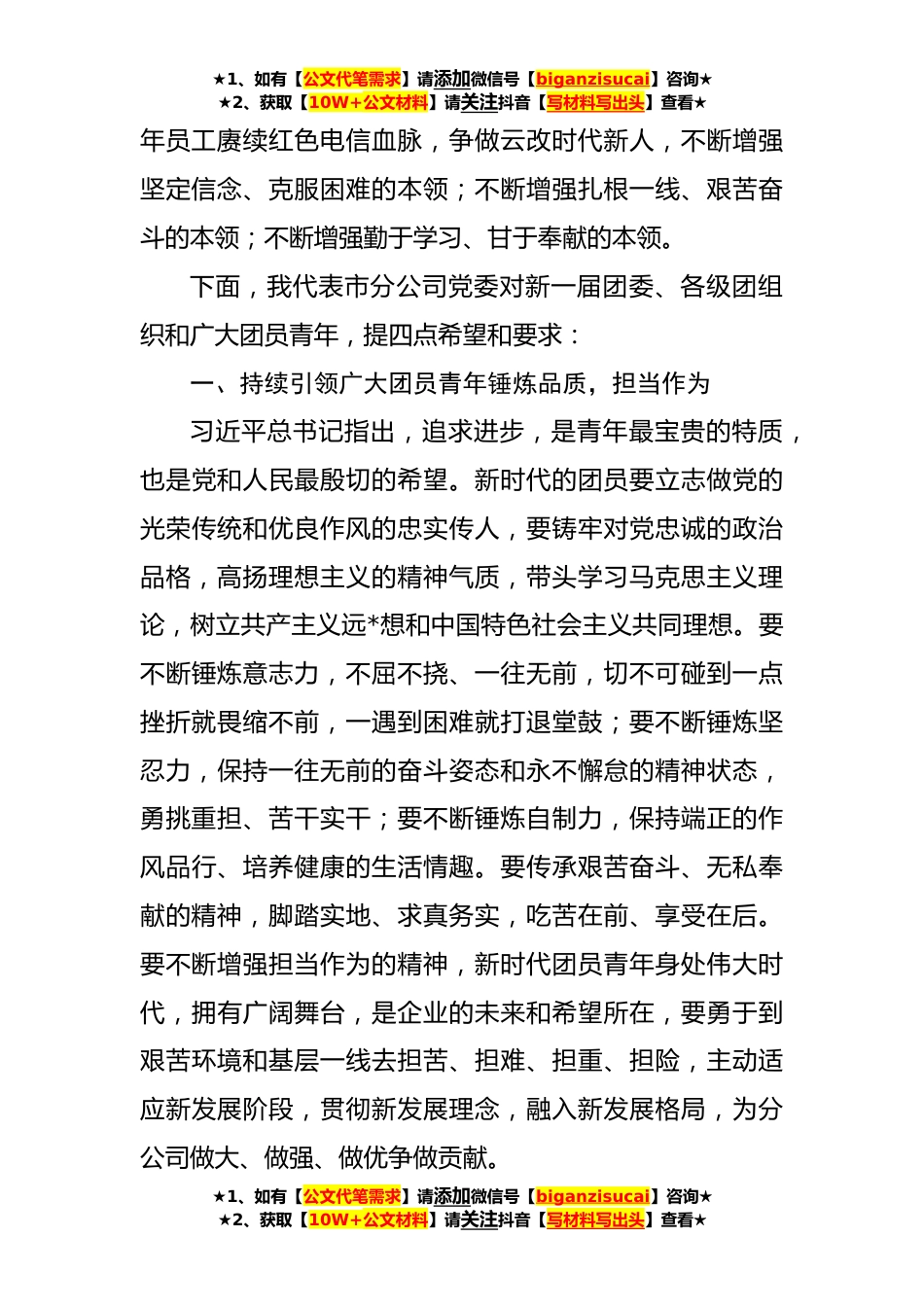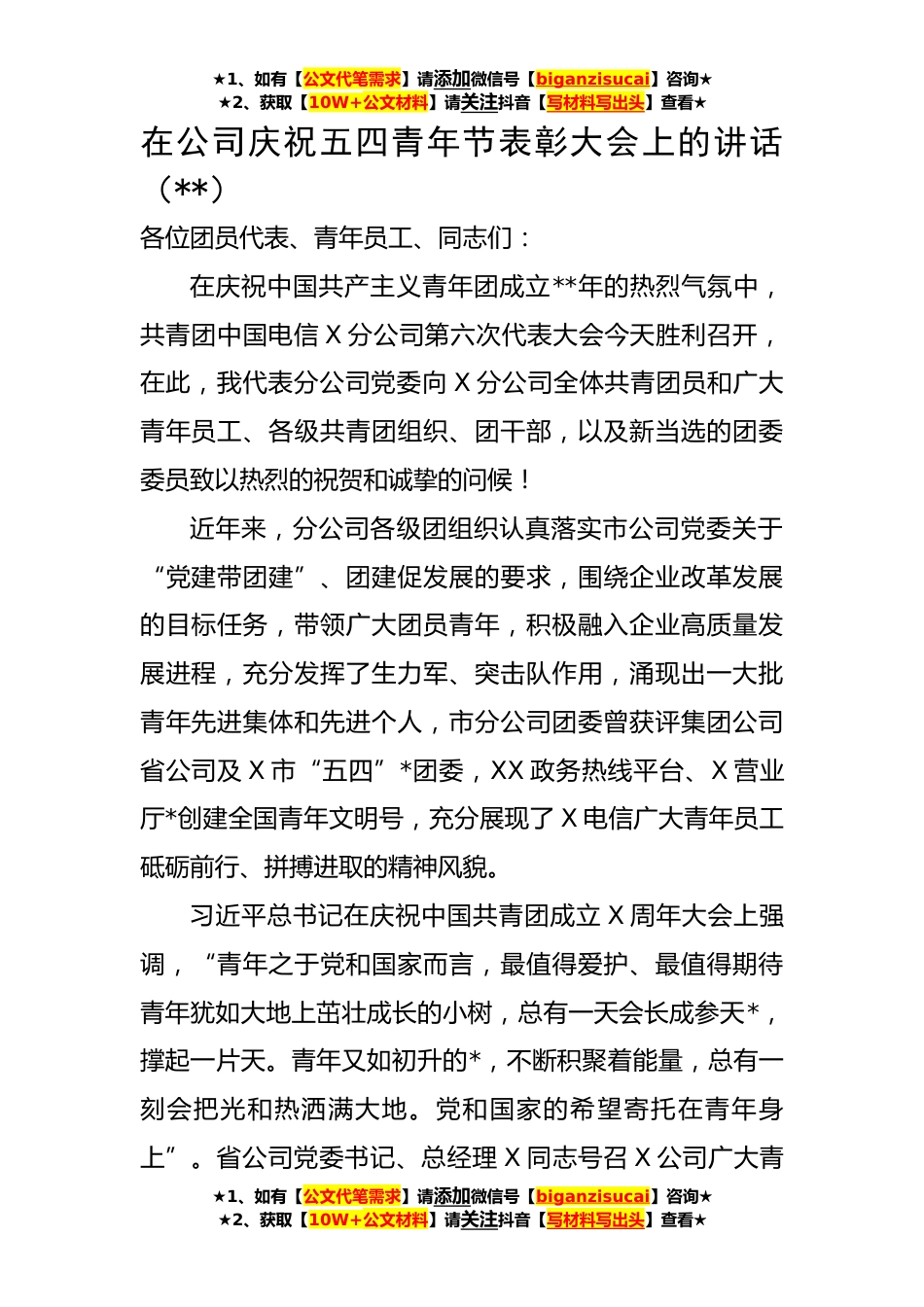 ★1、如有【公文代笔需求】请添加微信号【biganzisucai】咨询★★2、获取【10W+公文材料】请关注抖音【写材料写出头】查看★在公司庆祝五四青年节表彰大会上的讲话(**)各位团员代表、青年员工、同志们:在庆祝中国共产主义青年团成立**年的热烈气氛中,共青团中国电信X分公司第六次代表大会今天胜利召开,在此,我代表分公司党委向X分公司全体共青团员和广大青年员工、各级共青团组织、团干部,以及新当选的团委委员致以热烈的祝贺和诚挚的问候!近年来,分公司各级团组织认真落实市公司党委关于“党建带团建”、团建促发展的要求,围绕企业改革发展的目标任务,带领广大团员青年,积极融入企业高质量发展进程,充分发挥了生力军、突击队作用,涌现出一大批青年先进集体和先进个人,市分公司团委曾获评集团公司...