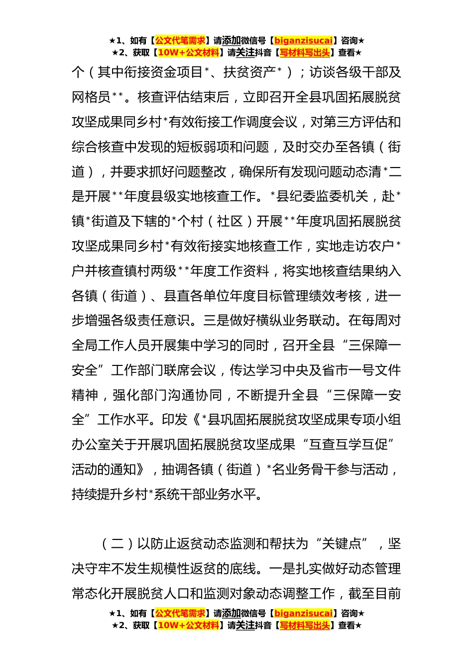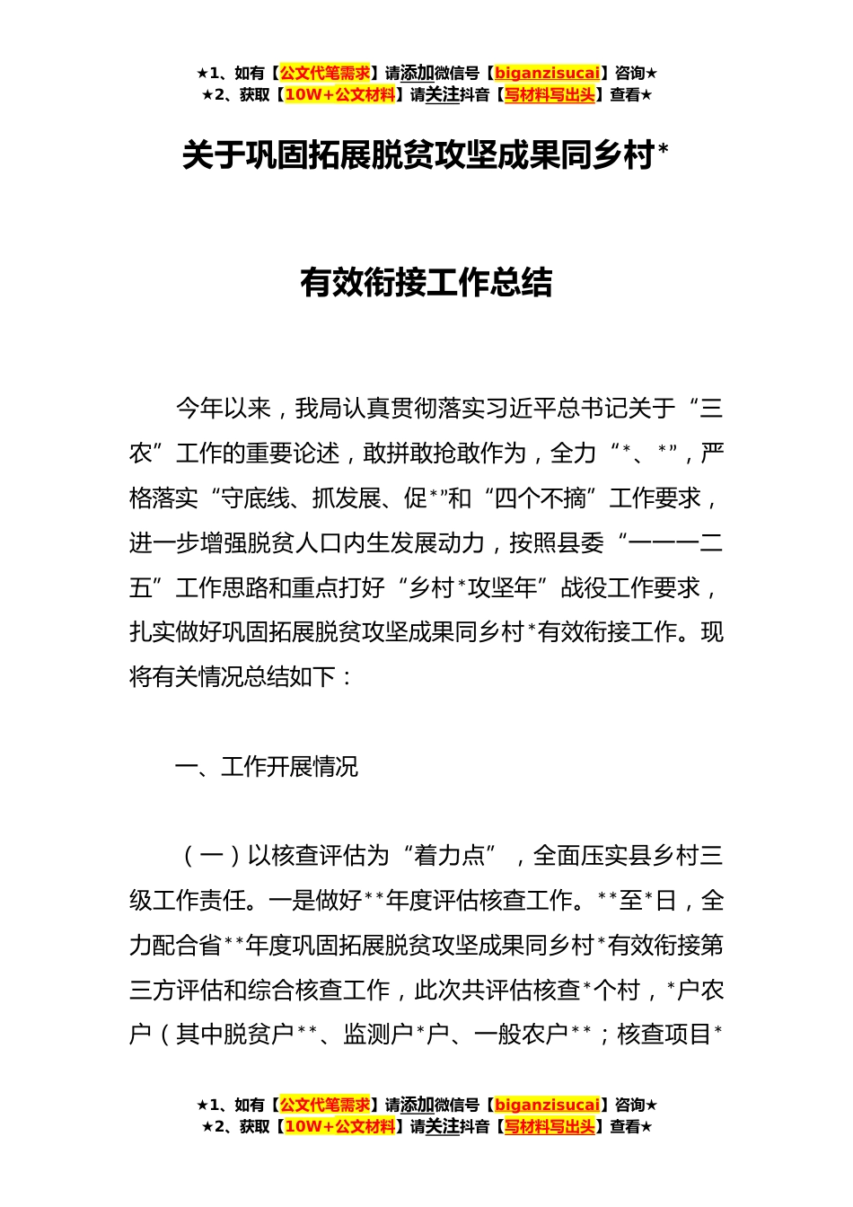 ★1、如有【公文代笔需求】请添加微信号【biganzisucai】咨询★★2、获取【10W+公文材料】请关注抖音【写材料写出头】查看★关于巩固拓展脱贫攻坚成果同乡村*有效衔接工作总结今年以来,我局认真贯彻落实习近平总书记关于“三农”工作的重要论述,敢拼敢抢敢作为,全力“*、*”,严格落实“守底线、抓发展、促*”和“四个不摘”工作要求,进一步增强脱贫人口内生发展动力,按照县委“一一一二五”工作思路和重点打好“乡村*攻坚年”战役工作要求,扎实做好巩固拓展脱贫攻坚成果同乡村*有效衔接工作。现将有关情况总结如下:一、工作开展情况(一)以核查评估为“着力点”,全面压实县乡村三级工作责任。一是做好**年度评估核查工作。**至*日,全力配合省**年度巩固拓展脱贫攻坚成果同乡村*有效衔接第三方评估和综...