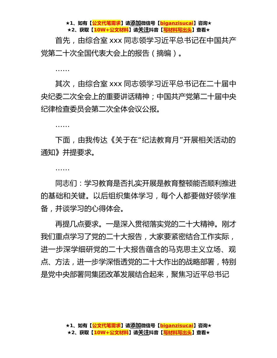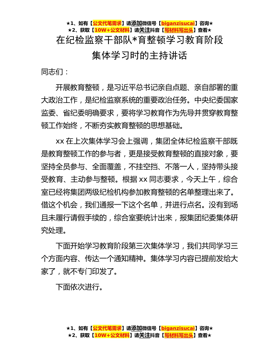 ★1、如有【公文代笔需求】请添加微信号【biganzisucai】咨询★★2、获取【10W+公文材料】请关注抖音【写材料写出头】查看★在纪检监察干部队*育整顿学习教育阶段集体学习时的主持讲话同志们:开展教育整顿,是习近平总书记亲自点题、亲自部署的重大政治工作,是纪检监察系统的重要政治任务。中央纪委国家监委、省纪委明确要求,要将学习教育作为先导并贯穿教育整顿工作始终,不断夯实教育整顿的思想基础。xx在上次集体学习会上强调,集团全体纪检监察干部既是教育整顿工作的参与者,更是接受教育整顿的直接对象,要坚持全员参与、全面覆盖,不挂空挡、不落一人,坚持带头接受教育、主动参与整顿。根据xx同志要求,今天上午,综合室已经将集团两级纪检机构参加教育整顿的名单整理出来了。借这个机会,我们通报一下...