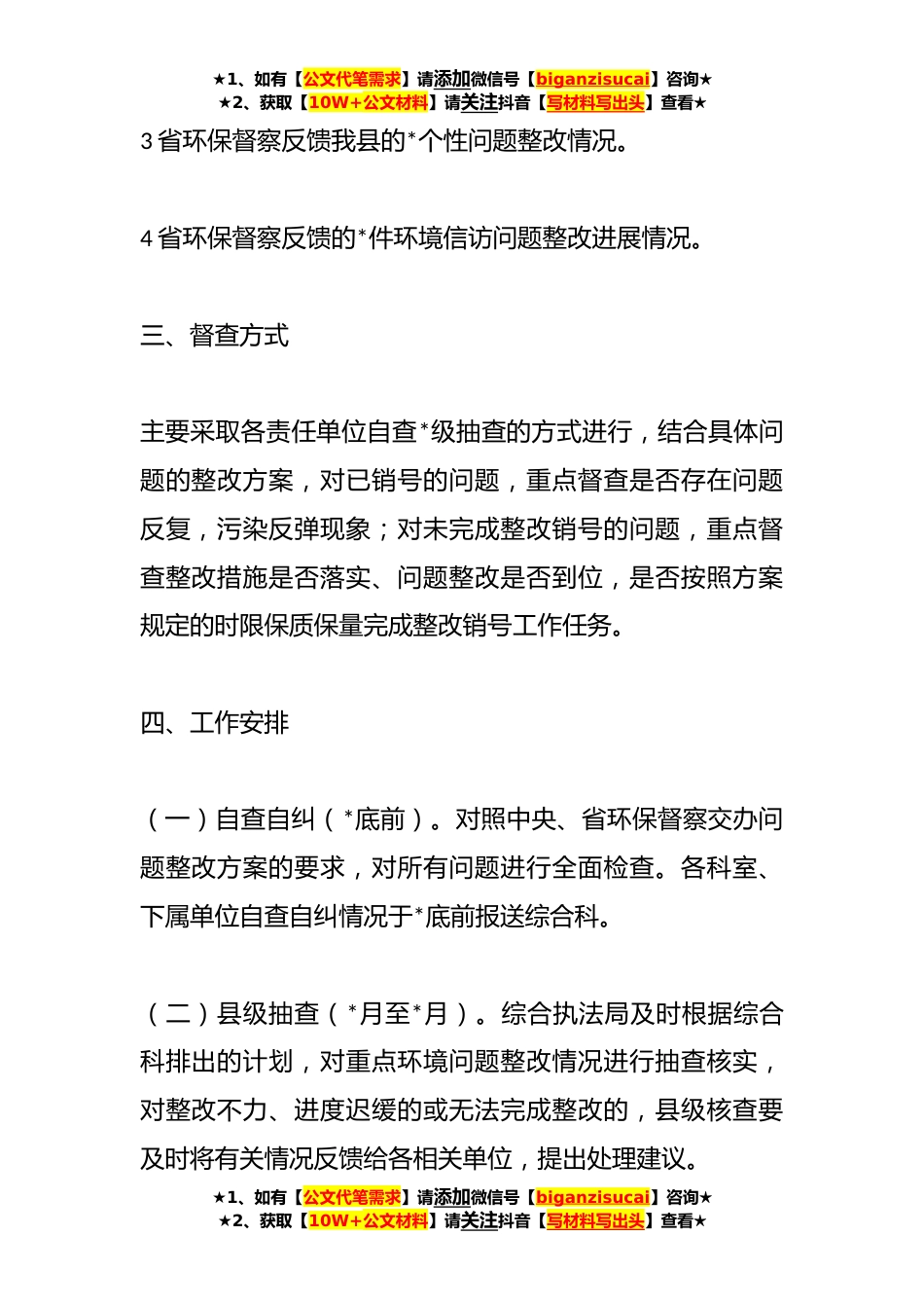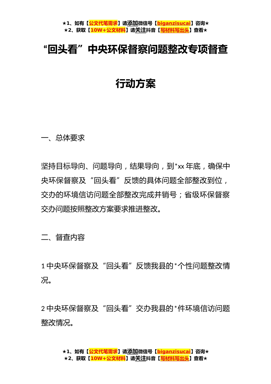 ★1、如有【公文代笔需求】请添加微信号【biganzisucai】咨询★★2、获取【10W+公文材料】请关注抖音【写材料写出头】查看★“回头看”中央环保督察问题整改专项督查行动方案一、总体要求坚持目标导向、问题导向,结果导向,到*xx年底,确保中央环保督察及“回头看”反馈的具体问题全部整改到位,交办的环境信访问题全部整改完成并销号;省级环保督察交办问题按照整改方案要求推进整改。二、督查内容1中央环保督察及“回头看”反馈我县的*个性问题整改情况。2中央环保督察及“回头看”交办我县的*件环境信访问题整改情况。★1、如有【公文代笔需求】请添加微信号【biganzisucai】咨询★★2、获取【10W+公文材料】请关注抖音【写材料写出头】查看★★1、如有【公文代笔需求】请添加微信号【biganzisucai】咨询★★2...