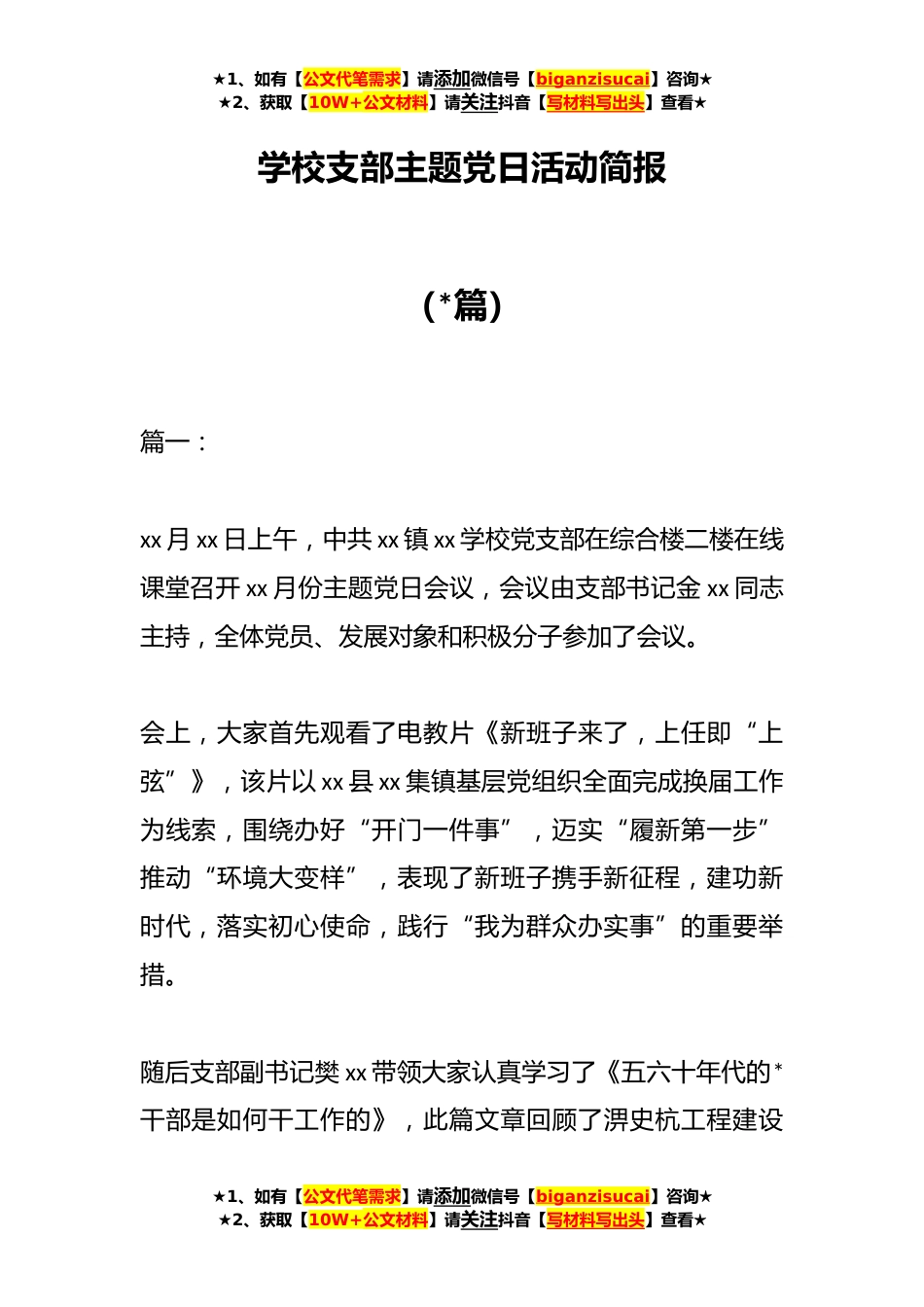 ★1、如有【公文代笔需求】请添加微信号【biganzisucai】咨询★★2、获取【10W+公文材料】请关注抖音【写材料写出头】查看★学校支部主题党日活动简报(*篇)篇一:xx月xx日上午,中共xx镇xx学校党支部在综合楼二楼在线课堂召开xx月份主题党日会议,会议由支部书记金xx同志主持,全体党员、发展对象和积极分子参加了会议。会上,大家首先观看了电教片《新班子来了,上任即“上弦”》,该片以xx县xx集镇基层党组织全面完成换届工作为线索,围绕办好“开门一件事”,迈实“履新第一步”推动“环境大变样”,表现了新班子携手新征程,建功新时代,落实初心使命,践行“我为群众办实事”的重要举措。随后支部副书记樊xx带领大家认真学习了《五六十年代的*干部是如何干工作的》,此篇文章回顾了淠史杭工程建设★1、如有...
