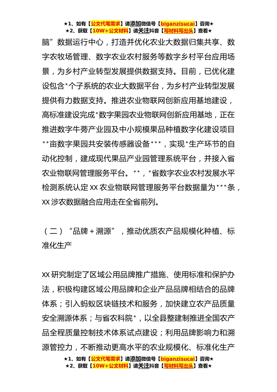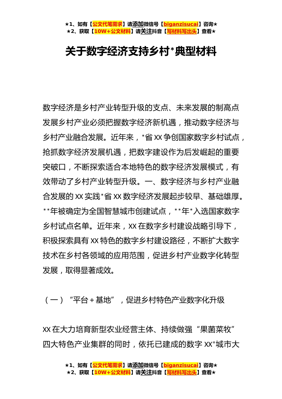 ★1、如有【公文代笔需求】请添加微信号【biganzisucai】咨询★★2、获取【10W+公文材料】请关注抖音【写材料写出头】查看★关于数字经济支持乡村*典型材料数字经济是乡村产业转型升级的支点、未来发展的制高点发展乡村产业必须把握数字经济新机遇,推动数字经济与乡村产业融合发展。近年来,*省XX争创国家数字乡村试点,抢抓数字经济发展机遇,把数字建设作为后发崛起的重要突破口,不断探索适合本地特色的数字经济发展模式,有效带动了乡村产业转型升级。一、数字经济与乡村产业融合发展的XX实践*省XX数字经济发展起步较早、基础雄厚。**年被确定为全国智慧城市创建试点,**年*入选国家数字乡村试点名单。近年来,XX在数字乡村建设战略引导下,积极探索具有XX特色的数字乡村建设路径,不断扩大数字技术在乡村各...